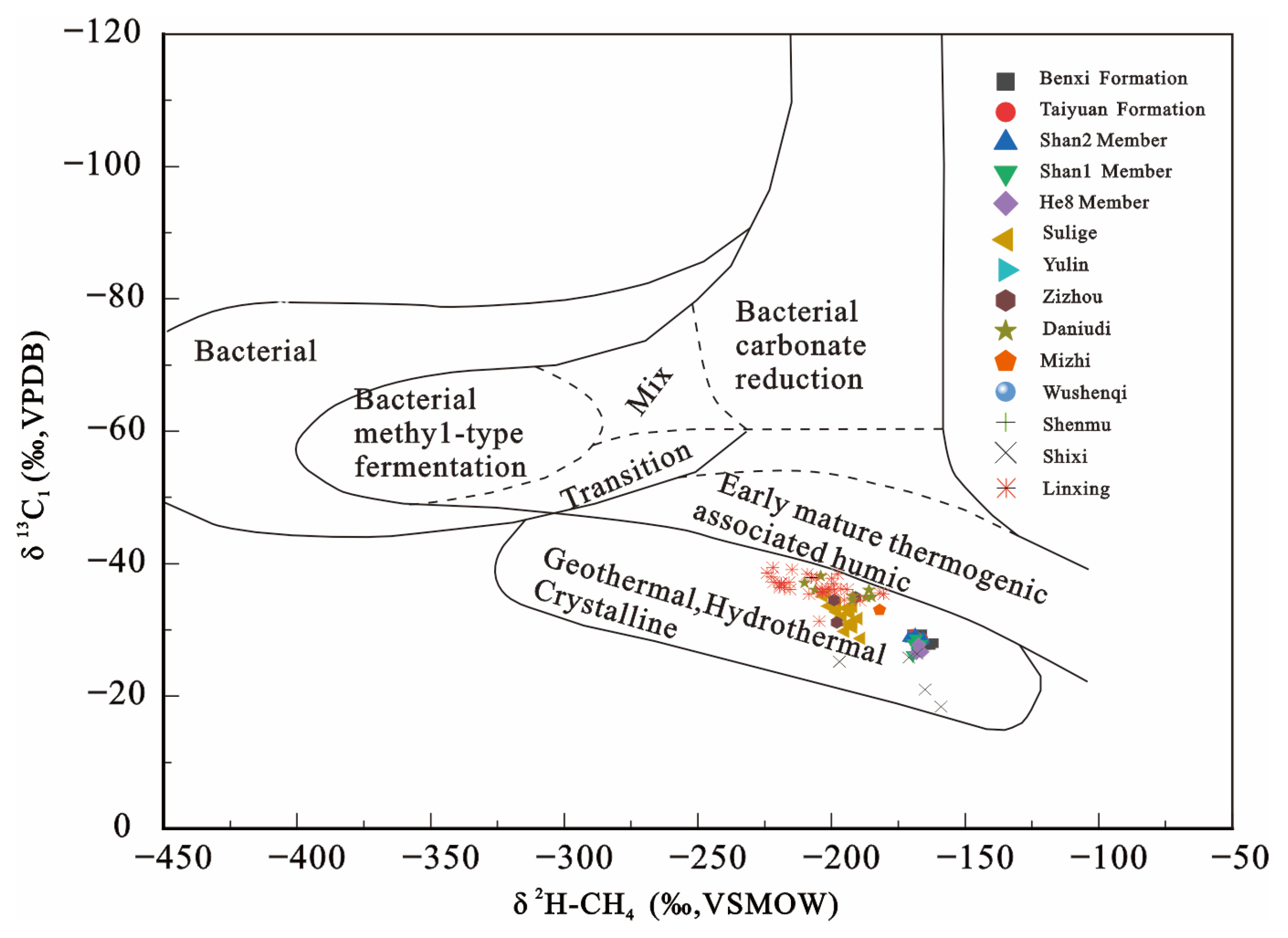 - The high maturity of kerogen in the Daning–Jixian area limits the application of some commonly used genetic identification diagrams. The classical Whiticar diagram based on δ13C1 and δ2H-CH4 was employed, revealing that all gas samples from the Daning–Jixian Block and other gas fields across the Ordos Basin fall into the domain of geothermal, hydrothermal, and crystalline gases, which suggests that the gas genesis is associated with the interaction of over-mature organic matter with external hydrogen. The Milkov diagram indicates that natural gases sampled from the other producing fields in the Ordos Basin consistently fall within the canonical coal-derived gas field with relatively lower maturity, with some samples from fields like Daniudi and Zizhou also exhibiting characteristics of oil-associated gas. In contrast, the study area contains thermogenic gas with higher maturity. The Daning–Jixian Block gas accumulations originate from early-stage kerogen cracking in Carboniferous–Permian source rocks, with a subordinate contribution from crude-oil cracking.