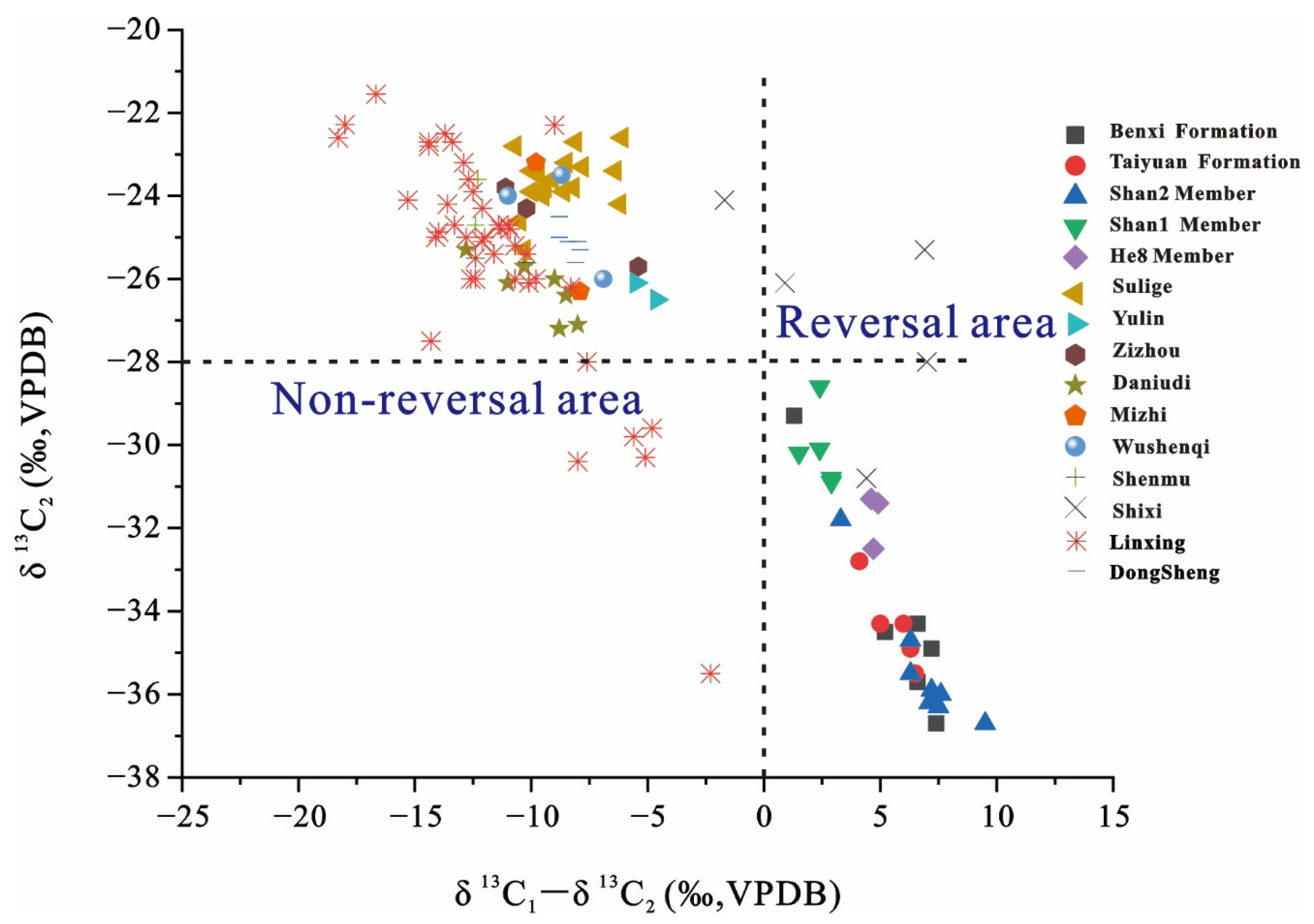 - Liu, C.; Lei, M.Y.; Sun, B.L.; Wang, X. Origin and process of carbon isotopic reversal of tight sandstone gas in the Shixi gas field, eastern margin of Ordos Basin. Int. J. Coal Geol. 2023, 276, 104327. [Google Scholar] [CrossRef]