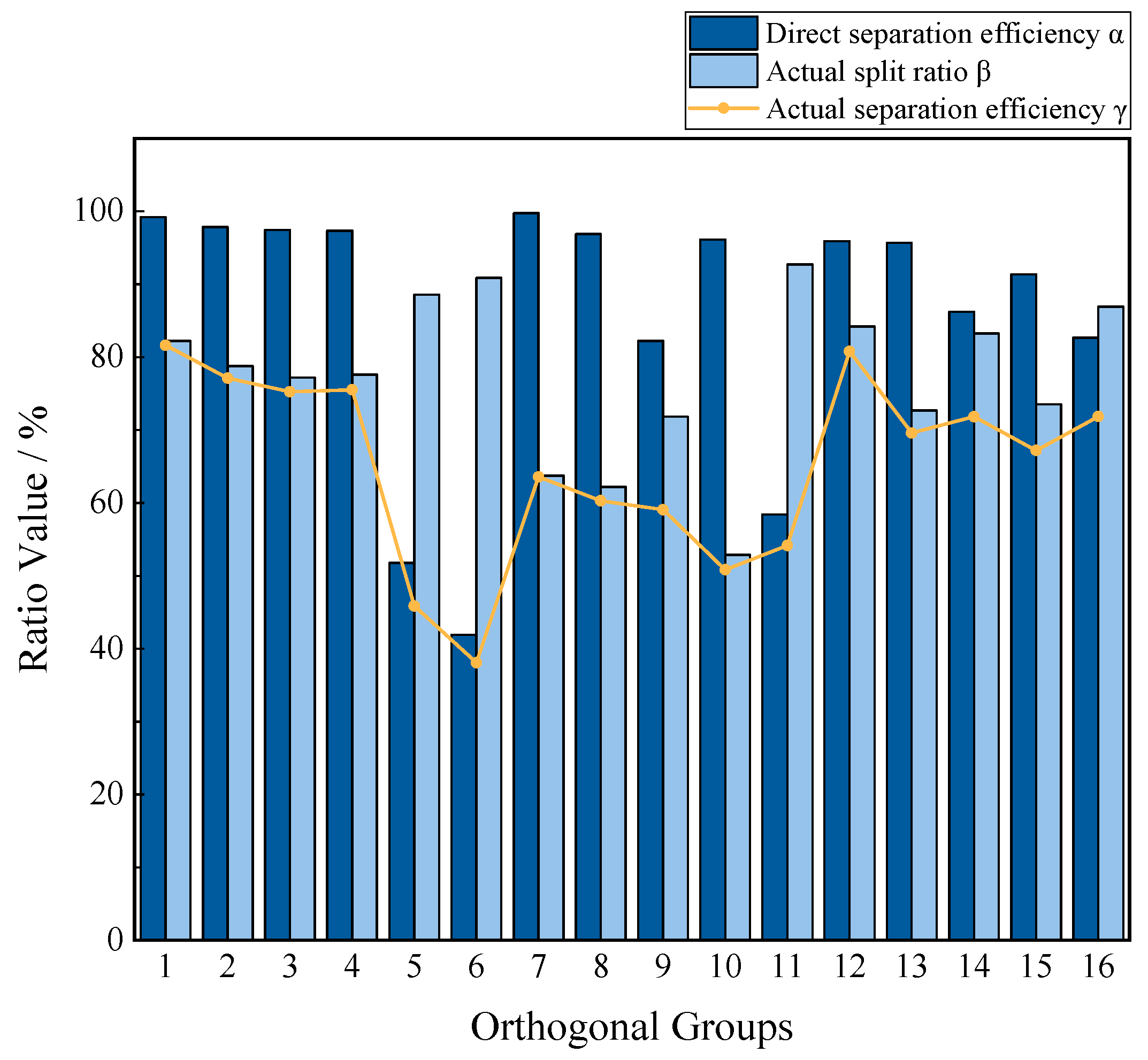 - To reflect the influence of mixed-phase entrainment, a more comprehensive evaluation framework is adopted. The direct separation efficiency α measures gas capture in the overflow stream, while the split ratio β describes the flow partition between the overflow pipe and the underflow orifice. The actual separation efficiency γ combines α and β and therefore represents gas removal under a given split, inherently accounting for liquid carryover. This metric provides a stronger basis for geometry optimization and for fair performance comparison across designs.