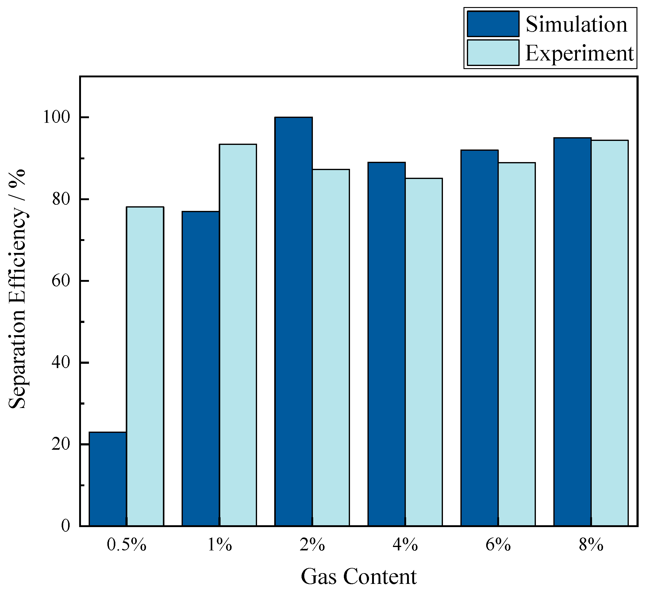 - A two-step design strategy is supported by the data. First, set the target β by matching Don and Ddown so that entrainment is bounded at the required operating split. Second, maximize γ by coordinating D and Hon, using H as an auxiliary lever to stabilize the gas core and the internal swirling field. The optimized geometry achieves a γ of about 80.8%. Experiments confirm consistent trends across 0.5% to 8% gas volume fraction, with separation generally above 77% and simulation-to-experiment differences below 20% when the gas fraction is at least 1%. These results provide an optimization method from geometry to performance for rapid screening and refinement of gas–liquid cyclone separators.