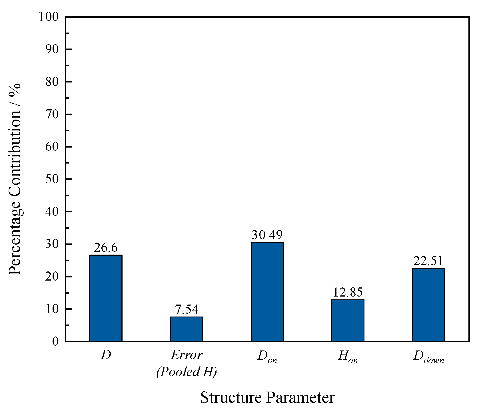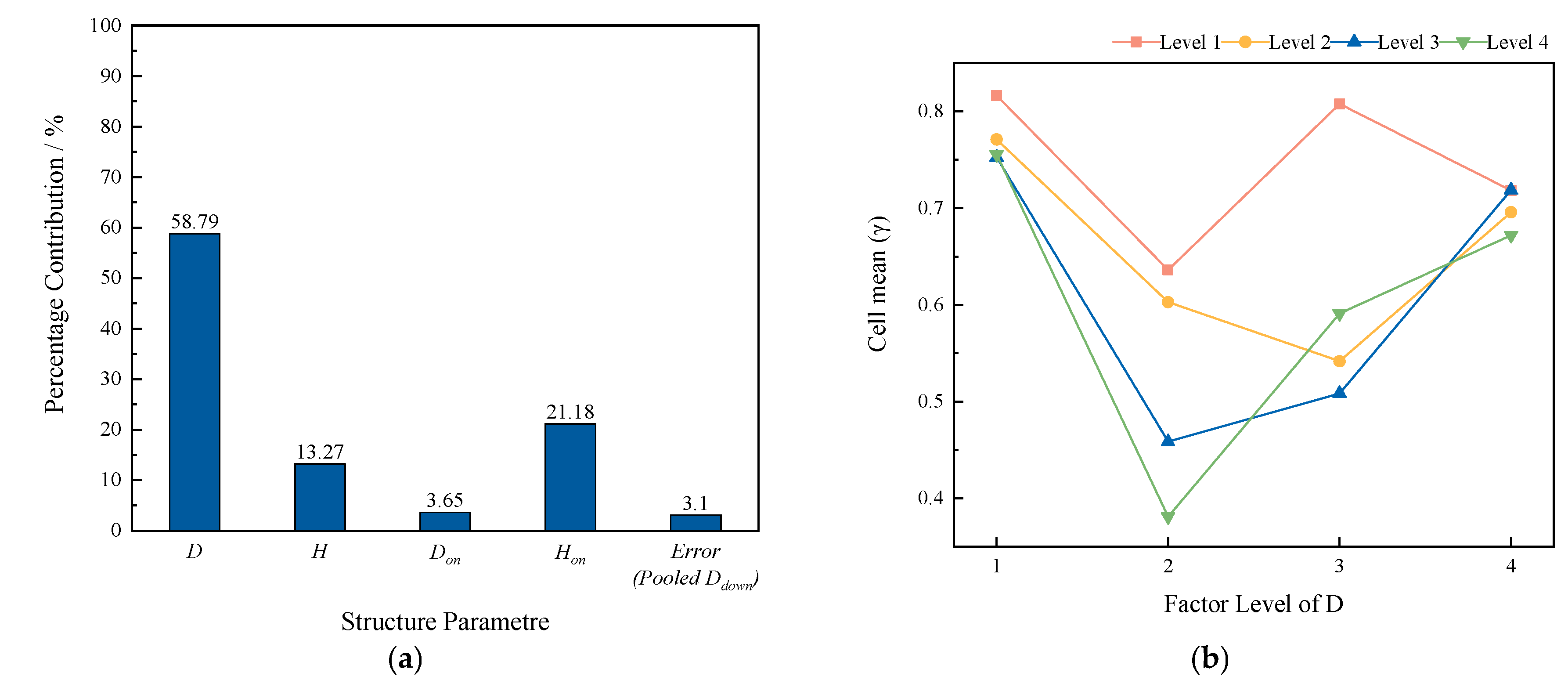 - Range analysis provided a rapid screening of factor importance, which was then quantified by pooled-error analysis of variance; both methods converged to the same hierarchy. The split ratio β is set by outlet sizing. The overflow pipe diameter, Don, contributes 56.87%, and the underflow orifice diameter, Ddown, contributes 39.26%, together about 96%. Their effects are nearly independent and monotonic, enabling direct tuning of entrainment and flow split. The actual separation efficiency γ is governed by body-scale geometry. The chamber diameter D contributes 58.79%, the insertion depth Hon contributes 21.18%, and the chamber height H contributes 13.27%. Mechanistically, D controls swirl intensity and core strength, Hon adjusts axial extent and residence time, and H stabilizes the position and persistence of the effective separation zone. Range analysis revealed the same monotonic trends and indicated a meaningful interaction between D and Hon for γ, which the variance analysis confirmed.