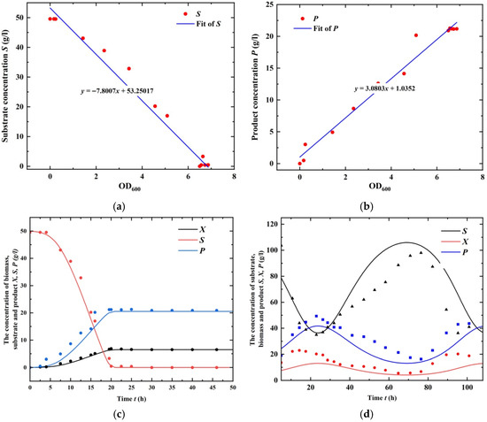 Experimental validation of the ethanol fermentation process. (a) Regression of Yxs (1/7.800) by batch fermentation data of substrate content against OD600; (b) regression of Yp (3.08) by batch fermentation data of product content against OD600, where the initial biomass is not zero, causing the curve to not necessarily intersect with the origin; (c) fitting of the kinetics of Equation (2) using batch fermentation data, where the delay of ethanol inhibition is not counted; (d) fitting of the oscillatory dynamics by varying the delay effect (τ = 21.72 h).