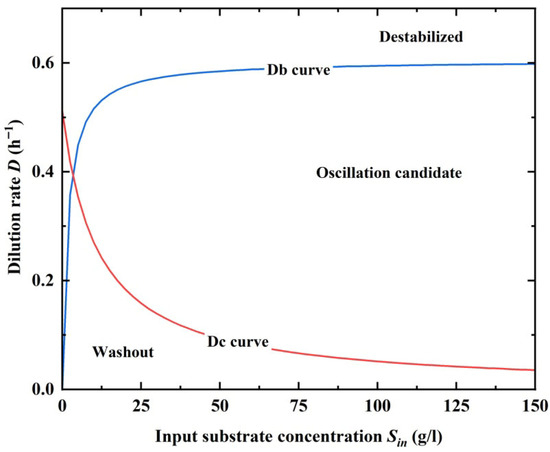 As shown in Figure 2, Dc and Db curves separate the parameter space into three segments, and in between are domains that might produce self-oscillatory dynamics when the delay time τ > τc; the Dc curve separates out the washout condition, and low substrate content and high dilution rate might lead the bio-process to washout; the Db curve is the stability line and the upper left segment causes the system to destabilize.
