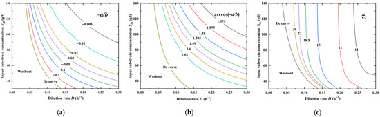 To obtain τc with varying D and Sin, Equation (13) is revisited. The calculation of a and b needs the equilibrium information (S*, X*, P*), which complicates the analytical expression of τc. Here, a stepwise method is proposed by using a symbol manipulation package Mathematica TM, where −a/b, arccos(−a/b), and τc are obtained consecutively. From Figure 3a, the series of lines approaches the Dc curve when −a/b → 1, leading to a quick decrease in ωc to zero (Figure 3b). The contour in Figure 3c shows that varying D could lead to a more significant change in τc than that of Sin; increasing D causes the oscillatory behavior to emerge more easily, and τc presents a drastic change by approaching the Dc curve.