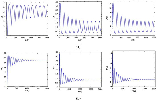 The generation of self-oscillation is examined by numerical simulations, where, by arbitrarily setting D = 0.142 h−1 and Sin = 35 g/L, it obtains τc = 20.97 h. Then, two points, τ = 23 h and τ = 20 h, are simulated and shown in Figure 4. For the stable one (τ = 21 h, Figure 4a), the system is attracted to three equilibria; whereas for the unstable one (τ = 23 h, Figure 4b), self-oscillations emerge. It bears noting that the increase in biomass content is in accordance with the increase in ethanol production as well as the decrease in residual substrate concentration, and the maxima of substrate consumption occur at the same time instants as the maxima of biomass and ethanol production. According to [24], the microorganism cells need time to adjust their enzyme system to accommodate high ethanol stress after the secretion of the product. Because of the delay response of microorganisms to the product, high ethanol content is accumulated. However, when the microorganisms begin to react with the high ethanol environment, biomass content undergoes a rapid decline, which then affects the secretion of the product and the living environment of the biomass. With a large amount of biomass under dormant conditions, the fermentation process is replaced by a high level of substrate, which is favorable for microorganism duplication and ethanol production, and provides an initial condition for the evolution to the next period of oscillations.