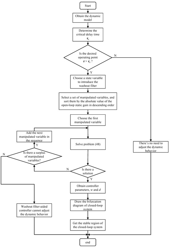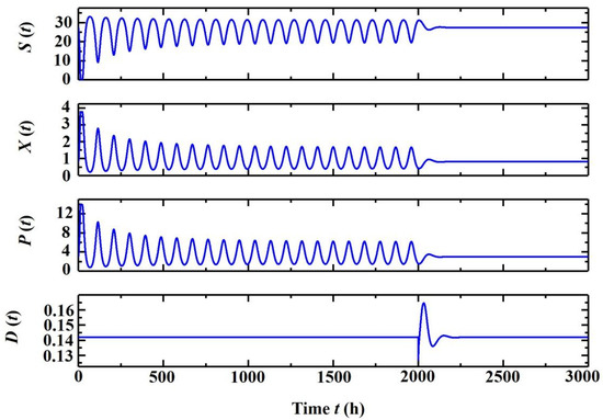 In this section, the above analysis on the stabilization of the bio-process using washout-filter-aided control is conducted in theory. The flowchart describing a possible route to mitigate the Hopf bifurcation by means of a washout filter is provided in Figure 7, where open-loop oscillations could be eliminated once switching on the washout-filter-aided control at t = 2000 h (Figure 8). It is observed that the control ΔD = ΔF/V responds to the oscillations rapidly, and after the system is stabilized, the control action ΔD might approach zero, indicating the equilibrium state is preserved through washout-filter-aided control, though the open-loop equilibrium is unstable.