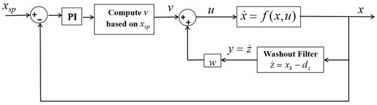 One problem with the proposed strategy is that the washout-filter-aided control is unable to achieve arbitrary set point tracking because it always converges to the equilibrium. Hence, Figure 9 is developed that presents the previous closed-loop system as an integral part, and an extra layer is added to realize set point tracking with PI control. Thus, the closed-loop system is altered to,