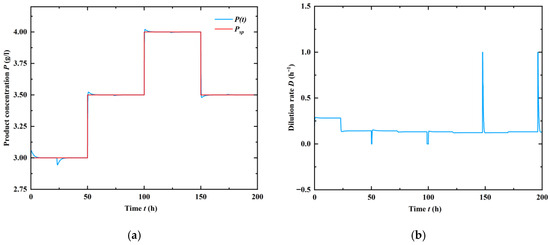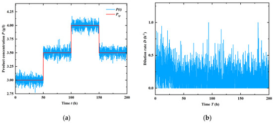 Tracking effect of adding measurement noises in control process. (a) Control performance of the given set-points; (b) Behavor of the manipulated variable, dilution rate.