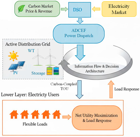 This paper proposes a system framework based on a bi-level optimization model, as shown in Figure 1. The upper-level decision-maker is the DSO, which is responsible for managing the ADNs containing distributed RES and ES. The DSO’s objective is to maximize the global revenue, with its core decision being to endogenously calculate and issue the ADCEF signal, based on which the revised electricity–carbon coupled price is formed. The lower level is an aggregated user model representing all flexible loads; as a price responder, its objective is to maximize its own net utility. Figure 1 illustrates the interactions between the levels: the DSO (upper level) computes and disseminates the ADCEF and coupled prices to guide user behavior; users (lower level) respond by adjusting loads to maximize utility with these adjustments feeding back into the DSO’s optimization through updated system states, forming a closed-loop coordination for flexibility enhancement. This framework supports the integration of carbon signals with operational decisions.