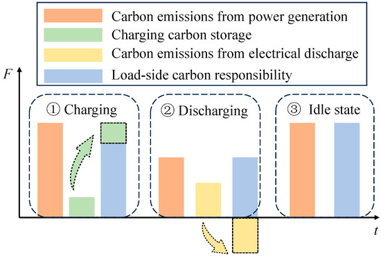 The principle of carbon emission conservation. State ① shows ES charging mode sharing emissions with loads; State ② depicts ES discharging mode releasing stored carbon; State ③ illustrates idle mode with unchanged carbon flows.
