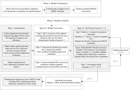 The bi-level model is formulated as a Mathematical Equilibrium Constraint Programming (MPEC) problem, which is non-convex and NP-hard. The solution method first transforms the bi-level model into a single-level MPEC by replacing the lower-level user utility maximization problem with its KKT optimality conditions (Section 4.1). Non-convexity is then addressed through the following: second-order cone programming (SOCP) relaxation for power flow constraints (Equations (18)–(20)); indicator constraints for complementary slackness conditions and piecewise functions, replacing the Big-M method to enhance numerical stability and convergence (Section 4.2); and sequential convex programming (SCP) for linearizing bilinear terms (Equations (4), (8) and (17)) via iterative mixed-integer second-order cone programming (MISOCP) subproblems (Section 4.3).
