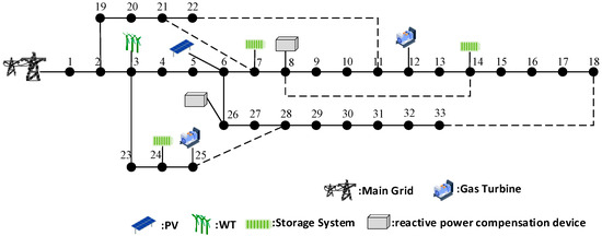 Global climate imperatives have accelerated the decarbonization of power systems, with active distribution networks (ADNs) playing a pivotal role in integrating high-penetration renewable energy sources (RES) such as wind and solar energy [1,2]. These networks enable localized energy management, reducing reliance on fossil fuels and supporting net-zero targets. However, the inherent volatility and intermittency of RES introduce operational challenges, including supply–demand imbalances, voltage fluctuations, and potential curtailment [3]. To achieve low-carbon economic operation, ADNs require enhanced flexibility through resources like energy storage (ES) and demand response (DR) [4]. These tools facilitate spatiotemporal energy shifting, promoting RES absorption while maintaining grid stability. Effective scheduling of such flexibility is essential to align economic incentives with environmental goals, minimizing carbon emissions in real-time operations [5].