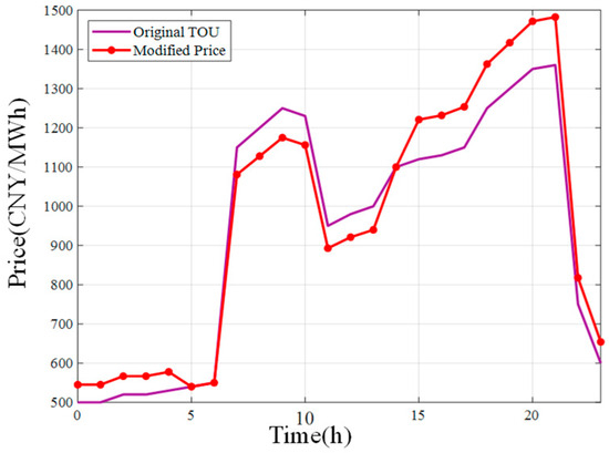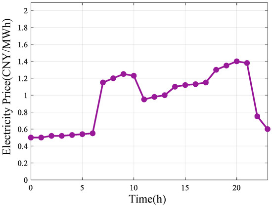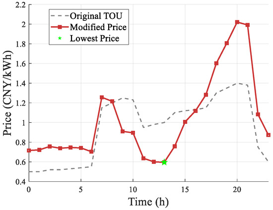 where is original price, is peak price, > 0 is the adjustment coefficient, and average network factor is . The price adjustment upper limit is determined by the coefficient, which is set to 1.5 in this study. This value is established based on empirical data from a demand response demonstration project conducted by a collaborating institution, where it was identified as the critical threshold that maximizes user participation response without triggering adverse rebound effects or excessive user dissatisfaction.