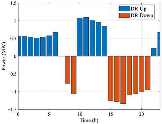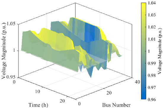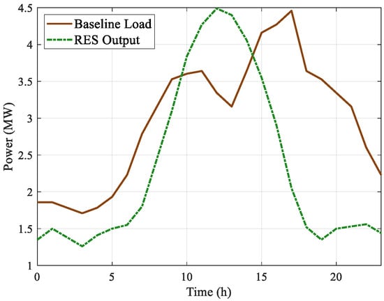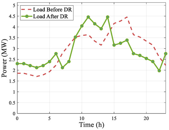 To confirm the physical feasibility of the aggressive load shifting observed in Figure 18, we examined the SOCP relaxation gap and thermal margins. The maximum relaxation error, calculated as , was found to be 1.8 × 10−5 p.u., confirming the exactness of the convex relaxation. Furthermore, regarding thermal limits, the optimization constraint (Equation (21)) successfully maintained branch flows within safety margins. During the peak absorption period (12:00), the current on the most stressed branch (feeder head) reached 92% of its rated capacity, ensuring that the 100% RES absorption was achieved without causing line overloads.