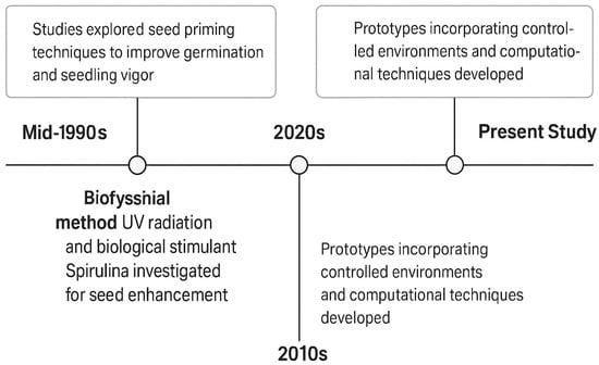 Table 1 summarizes representative previous work on seed priming prototypes, highlighting key technologies, target crops, and identified gaps. Figure 1 illustrates the timeline of the evolution of UVC prototypes.