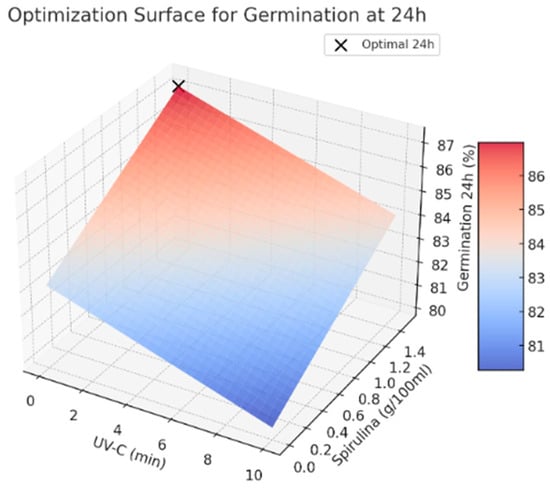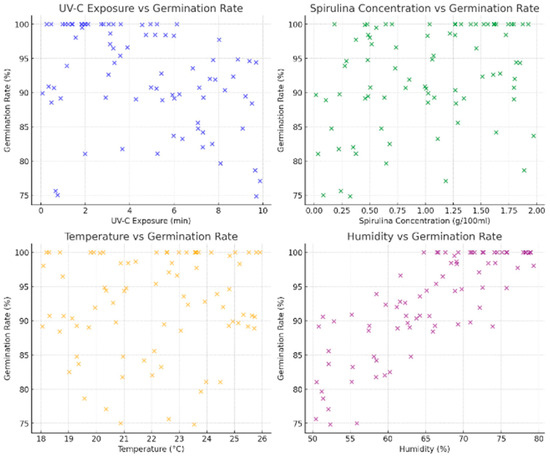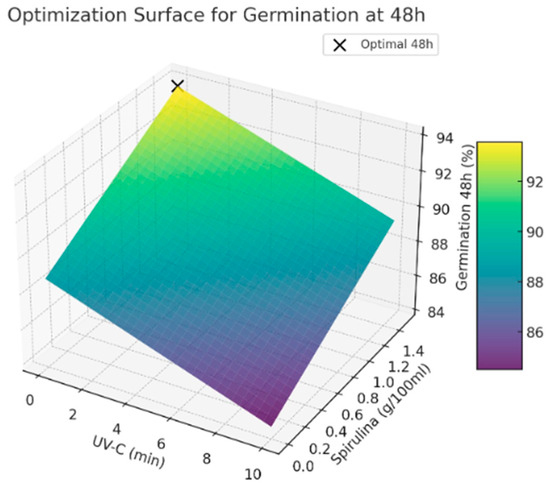 - If the goal is fast germination within 24 h, conditions that favor PC2 should be increased, meaning minimal UV-C exposure and higher Spirulina concentration.