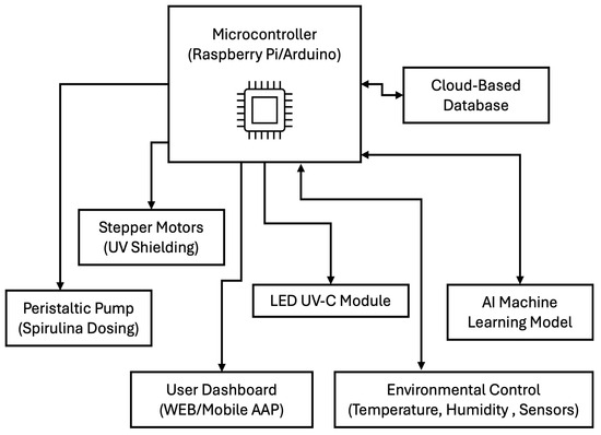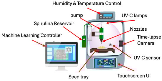 This proposed prototype is an automated seed treatment chamber that optimizes UV-C exposure, Spirulina concentration, and environmental factors to enhance germination, biomass, and flavonoid content. Thus, the developed prototype is an automated seed treatment chamber designed to optimize UV-C exposure, Spirulina concentration, and environmental conditions, thereby enhancing germination rates, biomass accumulation, and flavonoid content. The system incorporates several key functional modules. The UV-C radiation control system includes adjustable UV-C LED lamps with an exposure range of 0–10 min, an intensity control mechanism, a motorized shielding system to regulate exposure, and real-time UV-C sensors to ensure precise dosage application. An automated scheduler is integrated to enable timed UV-C treatment cycles. The Spirulina nutrient delivery system is controlled by a microcontroller, which accurately mixes different Spirulina concentrations within the range of 0–1.5 g/100 mL. A precision pump system delivers the Spirulina-infused liquid to the seeds, while a reservoir equipped with a stirring mechanism ensures uniform distribution of the Spirulina solution. The germination and environmental chamber feature a humidity and temperature control system, a moisture sensor to monitor water absorption, and a time-lapse camera to track germination progress, further optimizing germination conditions. An advanced data monitoring and optimization algorithm is implemented, integrating a machine learning-based controller that dynamically adjusts UV-C and Spirulina levels in response to the seed batch. The system features a user interface accessible via touchscreen or mobile application, enabling users to select specific germination goals, including Fast Germination mode for a 24 h cycle, High Biomass mode for maximizing seedling growth, and flavonoid enrichment mode for promoting enhanced secondary metabolite accumulation. Additionally, cloud-based data logging enables the long-term tracking of germination performance, allowing users to analyze historical data and refine treatment protocols further. Figure 5 illustrates the general schematic of the proposed prototype, highlighting the main blocks in the conceptual design. Figure 6 describes the prototype’s operational functionality.
