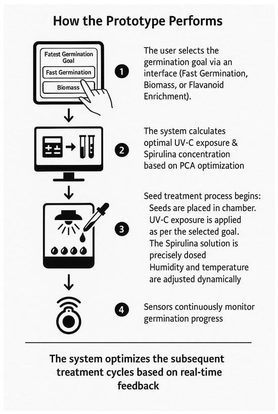 Based on the PCA optimization results, a functional prototype can be designed to dynamically adjust UV-C exposure and Spirulina levels, achieving specific germination and biomass goals. Based on the previous findings, a functional prototype is proposed to dynamically optimize UV-C exposure and Spirulina application dynamically, thereby enhancing seed germination and biomass accumulation. This prototype features a programmable UV-C LED system that enables precise control over exposure time and intensity, ensuring optimal UV-C levels for enhanced germination. An automated peristaltic pump system accurately dispenses Spirulina solution to the seeds, maintaining consistency in nutrient delivery. A climate-controlled chamber is integrated into the system to regulate humidity, temperature, and moisture levels, optimizing the environmental conditions necessary for germination. A monitoring system equipped with time-lapse imaging and real-time moisture sensors continuously tracks the germination process, providing data for further optimization. The system also incorporates an AI-driven algorithm that dynamically adjusts treatment parameters based on real-time feedback, allowing users to set specific germination objectives. The prototype offers various operational modes tailored to specific needs, including a Fast Germination mode for rapid seedling emergence, a High Biomass mode for increased fresh and dry weight, and a Flavonoid Enrichment mode that optimizes conditions for secondary metabolite accumulation. A user-friendly interface enables researchers and farmers to customize and monitor seed treatments remotely. At the same time, cloud-based data logging supports long-term trend analysis and optimization of seed treatment protocols.