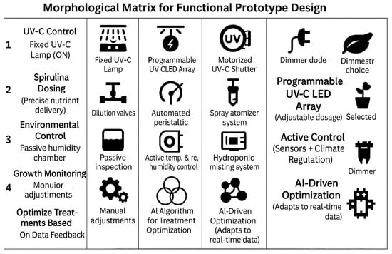 In [8], statistical techniques such as Analysis of Variance (ANOVA) and Principal Component Analysis (PCA) to optimize the conceptual design are used; it evaluates the impact of different UV-C exposure times and Spirulina concentrations on germination rate, fresh and dry biomass accumulation, and flavonoid content to create a conceptual design of a functional prototype. These findings reveal that while UV-C exposure alone does not significantly enhance germination, the integration of Spirulina treatment substantially improves seedling development. While UV-C treatment alone did not significantly enhance germination rates, a slight improvement in early germination (24–48 h) was observed at 5 min of exposure. Spirulina conditioning, particularly at moderate concentrations (0.5–0.75%), had a more pronounced positive effect on physiological parameters such as aerial part and seedling fresh weight, and dry weight. The combination of 5 min UV-C exposure with 0.5–0.75% Spirulina provided the most balanced results, improving seedling development without causing structural damage. In contrast, a 10 min UV-C treatment could negatively impact on seed physiology, leading to tissue degradation and reduced water content, especially under higher Spirulina concentrations. For the proof-of-concept design, optimal germination rates were proposed to be 87.11% at 24 h and 93.73% at 48 h, under conditions with no or minimal UV-C exposure and a Spirulina concentration of 1.5 g/100 mL. These values can be adjusted according to seed type and specific environmental conditions. One of the key contributions of this study is the development of a robust methodology for designing a conceptual prototype based on empirical data. The experimental data presented in [8] served primarily as a reference to approximate real-world conditions. However, the design parameters can be further refined and proposed through targeted experiments tailored to specific agricultural needs. Thus, it is proposed to conceptually design an AI-optimized functional prototype that dynamically regulates seed treatment conditions. This automated seed treatment chamber integrates monitoring and control of UV-C exposure and Spirulina supplementation, enabling users to select specific germination goals such as Fast Germination, High Biomass, or Flavonoid Enrichment. The prototype utilizes machine learning algorithms to adjust treatment conditions in real-time, ensuring adaptive and optimized seed conditioning [8].