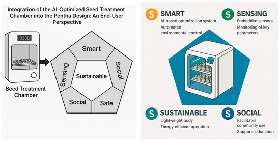 The chamber’s interface is tailored to diverse user needs, guided by the OCEAN (Big Five) personality model [45]. Users high in openness, such as experimental researchers or hobbyist gardeners, can explore advanced settings and novel treatment protocols. Conscientious users, such as school instructors or farm managers, benefit from detailed monitoring tools and precise scheduling. Extraverted users, including community garden leaders, can use the chamber to organize collaborative projects and public demonstrations. Agreeable users, such as volunteer coordinators, are drawn to the social and educational potential of the chamber. Users with higher neuroticism, such as novice gardeners, find reassurance in the system’s reliability, safety, and clear feedback, which reduces anxiety about outcomes. The integration of the AI-optimized seed treatment chamber into the Penta-S design is a clear example of how advanced agricultural technology can transform smart cities. By addressing the specific needs and preferences of diverse end users, urban farmers, community gardens, schools, researchers, and local governments, the chamber offers a multidimensional solution that strengthens sustainability, resilience, social inclusion, and citizen empowerment. It not only enhances agricultural productivity but also advances broader urban goals, including climate action, food security, and community engagement. This integration demonstrates how precision agriculture, when thoughtfully designed and inclusively implemented, can play a central role in shaping smarter, more connected, and more sustainable cities. Figure 12 shows the integration of the prototype with the Penta-S design.