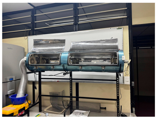 - Integrated Biological and Physical Priming vs. Disinfection Only: Prior UV-C chambers, whether Mahmood et al.’s cylindrical wheat-seed box [46], Popović et al.’s industrial 12-lamp corn chamber [47], or the IPN’s rotating-UV-C lamp maize sterilizer [5,48] (see Figure 16), focus solely on delivering germicidal radiation under static, open-loop control. By contrast, our design pairs UV-C exposure with programmable Spirulina dosing, leveraging their synergistic effects on both germination vigor and secondary metabolite enrichment, a feature absent from purely disinfection systems.