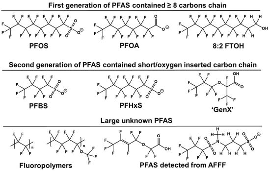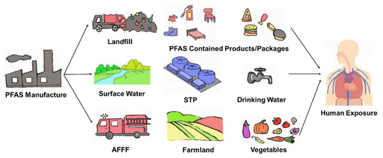 Water systems, airborne particulate matter, soil, and the food supply are significant sources of residual PFOA/PFOS and emerging PFAS contaminants [7]. Additionally, firefighting foams used at fire scenes and training areas often contain complex formulations with hundreds of PFAS compounds [10,11]. The widespread application of high-resolution spectrometers over the past decade has revealed an increasing number of previously unrecorded PFAS types in the environment. By detecting PFAS at their sources, in environmental media, and at various levels in the food chain, we can trace the exposure history of specific PFAS as they transition from industry sources to ecosystem and humans. It has been reported that adults primarily encounter PFAS through ingestion of dust and food, inhalation of air, and consumption of drinking water [12,13]. In addition, fetuses and infants can be exposed to PFAS via transplacental transfer during pregnancy and through breastfeeding during early life [14,15,16].