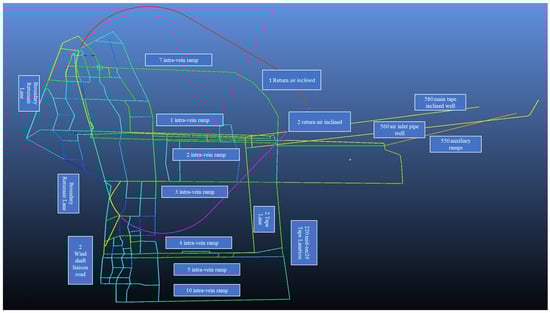 The centerlines of the main roadways were extracted from the mine ventilation network diagram utilizing three-dimensional polyline features in CAD software 2024. These were subsequently employed to construct the physical model of the overall ventilation system for Maping Phosphate Mine. The model was subsequently imported into Ventsim software for the purpose of generating the three-dimensional physical model of the mine ventilation system, the results of which are presented in Figure 1.