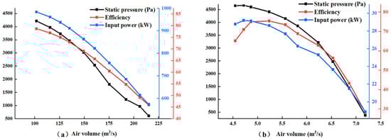 (a) Characteristic curves of the main ventilator; (b) Characteristic curves of the local ventilator.