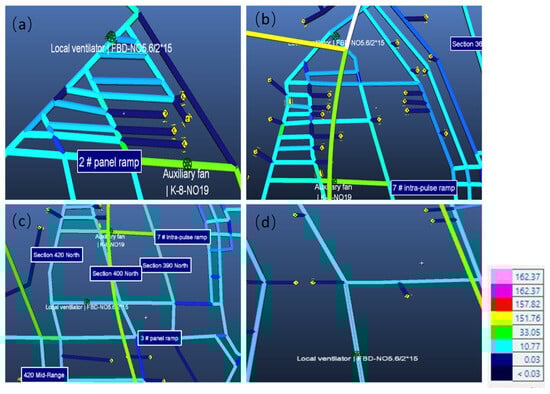 A comprehensive analysis of the mining area layout and working face distribution was performed to study dust diffusion patterns and control strategies within the ventilation system. Subsequently, dust generation sources were pinpointed in three critical areas undergoing mining and excavation activities: namely, the B4 strip in Area 340B, the B8 strip in Area 380B, and the ramp of the No. 4 coil in Area 420D. Based on the analysis of on-site monitoring data and dust diffusion characteristics, the dust emission concentration parameter was determined as 58.4 mg/m3. Hence, the emission rate S (mg/s) is calculated using the formula S = 58.4 × Q, where Q represents the airflow rate (m3/s). A perfectly mixed model is applied at the network nodes, which assumes that all incoming dust-laden air streams undergo instantaneous and complete mixing. This process yields a single, homogeneous dust concentration in every outflowing air stream, thereby neglecting the effects of localized turbulence or internal concentration gradients within the node. The standard pollutant dispersion module in Ventsim does not account for dust deposition losses caused by gravitational settling or wall collisions. It simplifies dust transport by treating all emitted dust as a conservative passive scalar that moves entirely with the airflow until it exits the mine system. This approach offers acceptable accuracy when simulating fine particulate matter with strong suspension capabilities or when modeling over relatively short distances. The Ventsim software was used to simulate dust diffusion paths and concentration distributions within the ventilation network based on this parameter, with the resulting dust concentrations for all roadways under the three ventilation schemes provided in Table 4.