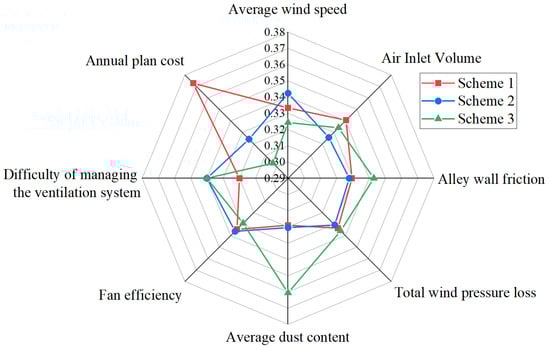 Based on the TOPSIS evaluation, Scheme Two is identified as the optimal ventilation scheme with the highest relative closeness degree of 0.8838, compared to 0.5612 for Scheme One and 0.3107 for Scheme Three. As illustrated in Figure 6, the superior performance of Scheme Two is evident in its balanced achievement across critical metrics such as average wind speed, system pressure loss, roadway friction coefficient, and total air intake volume. By implementing more reasonable regional airflow adjustments, Scheme Two enables the ventilation system to attain a near-optimal operational state. Its true strength lies in superior systemic integration: despite not being optimal in cost or fan efficiency individually, it achieves a critical improvement in overall system balance, thereby addressing the core practical needs of safety and ventilation performance.