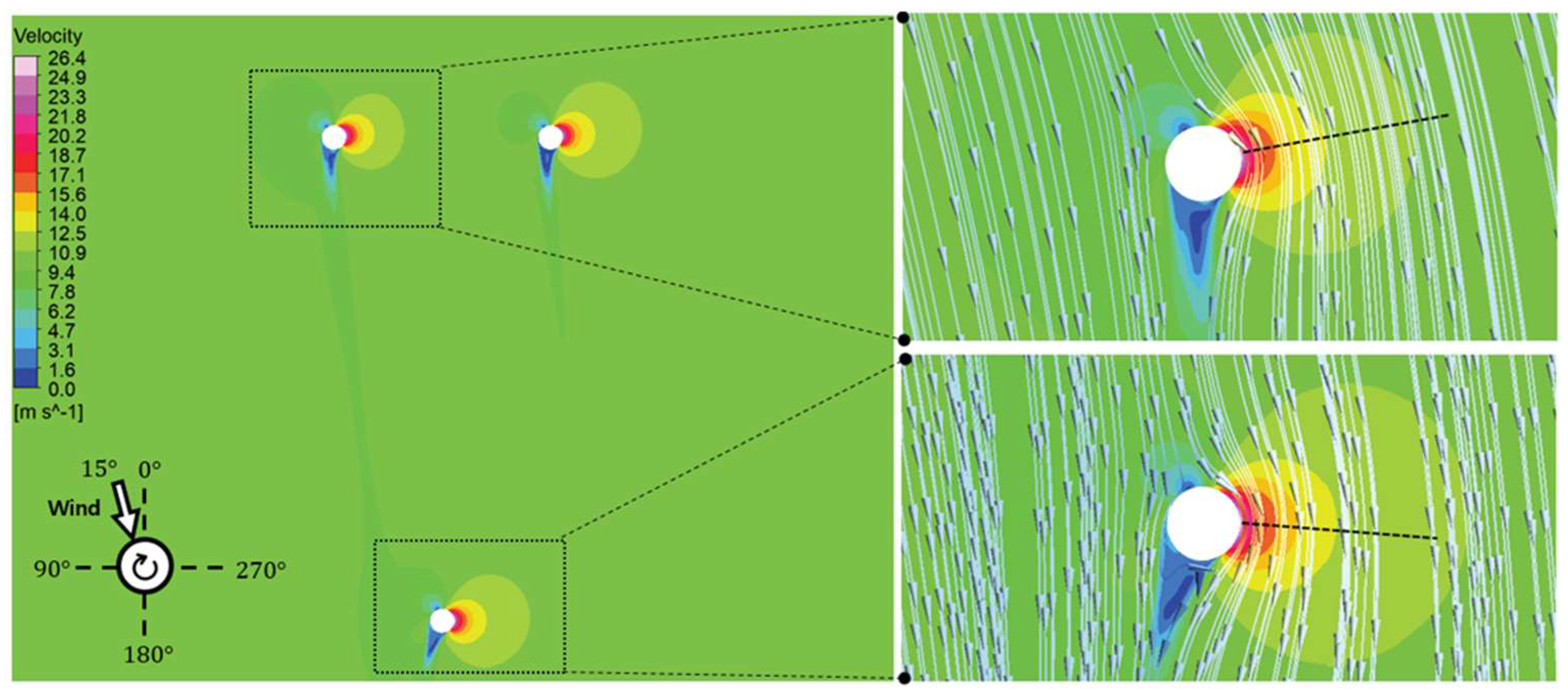 3.2. Flow Field and Wake Recovery Analysis for Rotor Sail Deployment