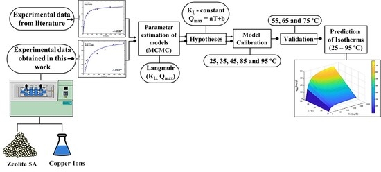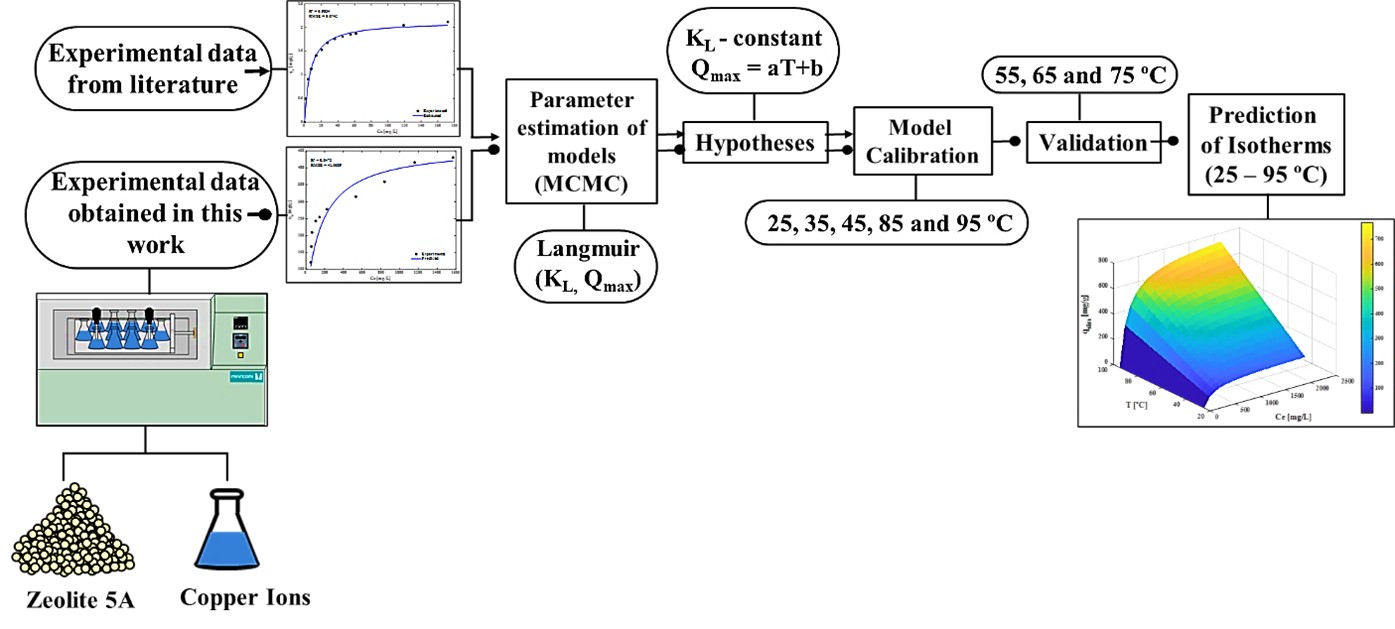 Step 1: Five experimental isotherms of copper ion adsorption (25 °C, 35 °C, 45 °C, 85 °C, and 95 °C) were selected for model calibration. Based on the estimated values of Qmax at these temperatures, a linear regression was performed to estimate the coefficients a and b. The parameter KL was considered constant according to the previously performed sensitivity analysis.