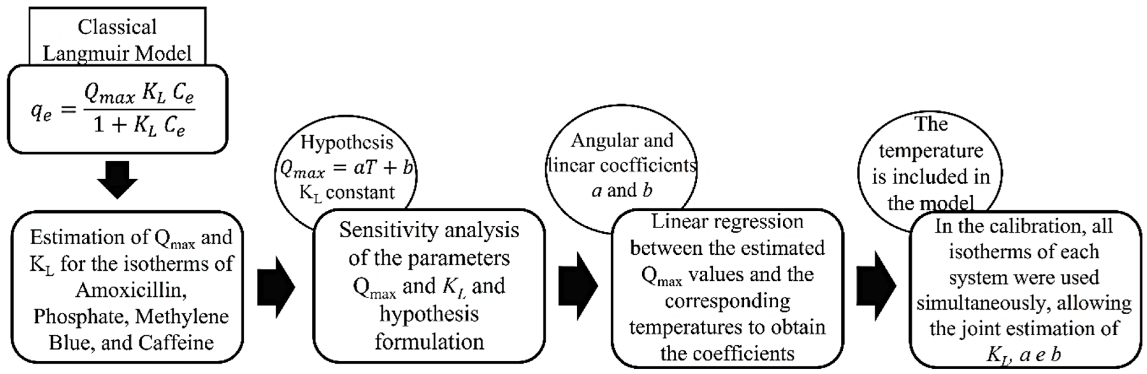 For each system, the classical Langmuir model was considered, for which an initial estimate of the constant KL was used, based on the order of magnitude of the original estimations. The maximum adsorption capacity (Qmax) was estimated for each temperature, restricted to a range between the highest experimentally adsorbed amount in each isotherm and up to 50% above this experimental limit. From these estimations, a sensitivity analysis of the model parameters was carried out, and the hypotheses that Qmax depends linearly on temperature while KL is considered constant with respect to temperature were proposed. Subsequently, linear regression was applied between the estimated values of Qmax and the respective temperatures (in Kelvin) to obtain the coefficients of the proposed adaptation.