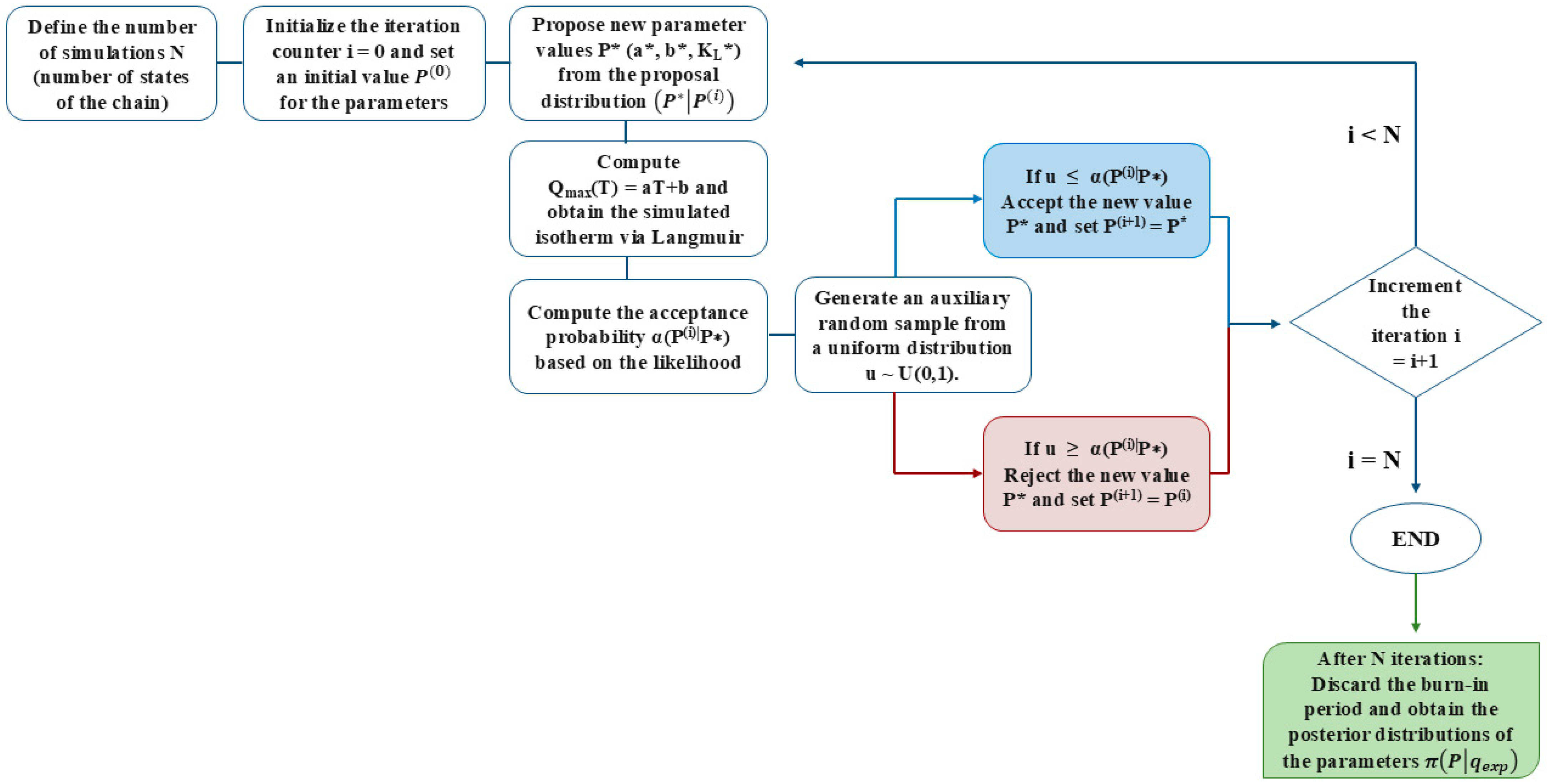 Figure 2 presents a flowchart illustrating the operation of the Metropolis–Hastings algorithm used in this study for the parameter estimation of the adapted Langmuir model.