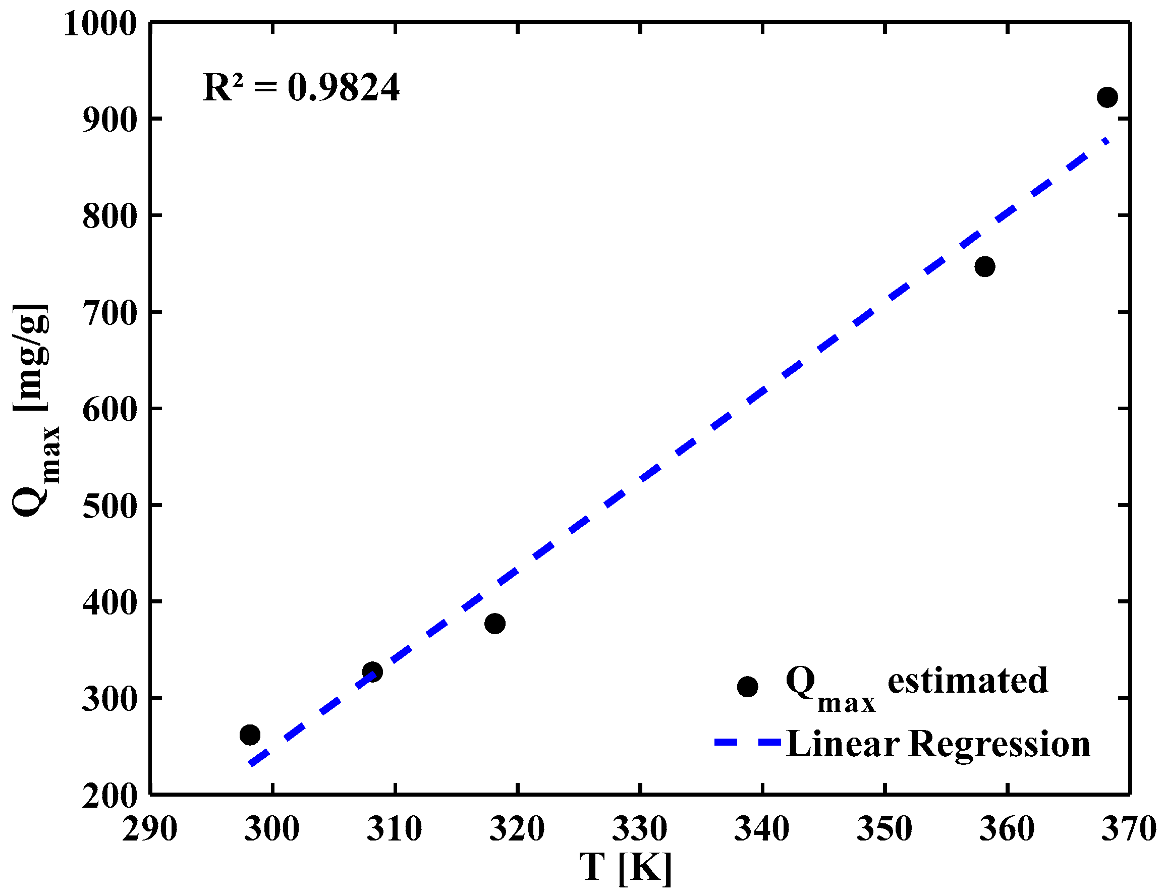 L was considered constant, that is, independent of temperature, and the maximum adsorption capacity was expressed as a linear equation as a function of temperature (Equation (7)).