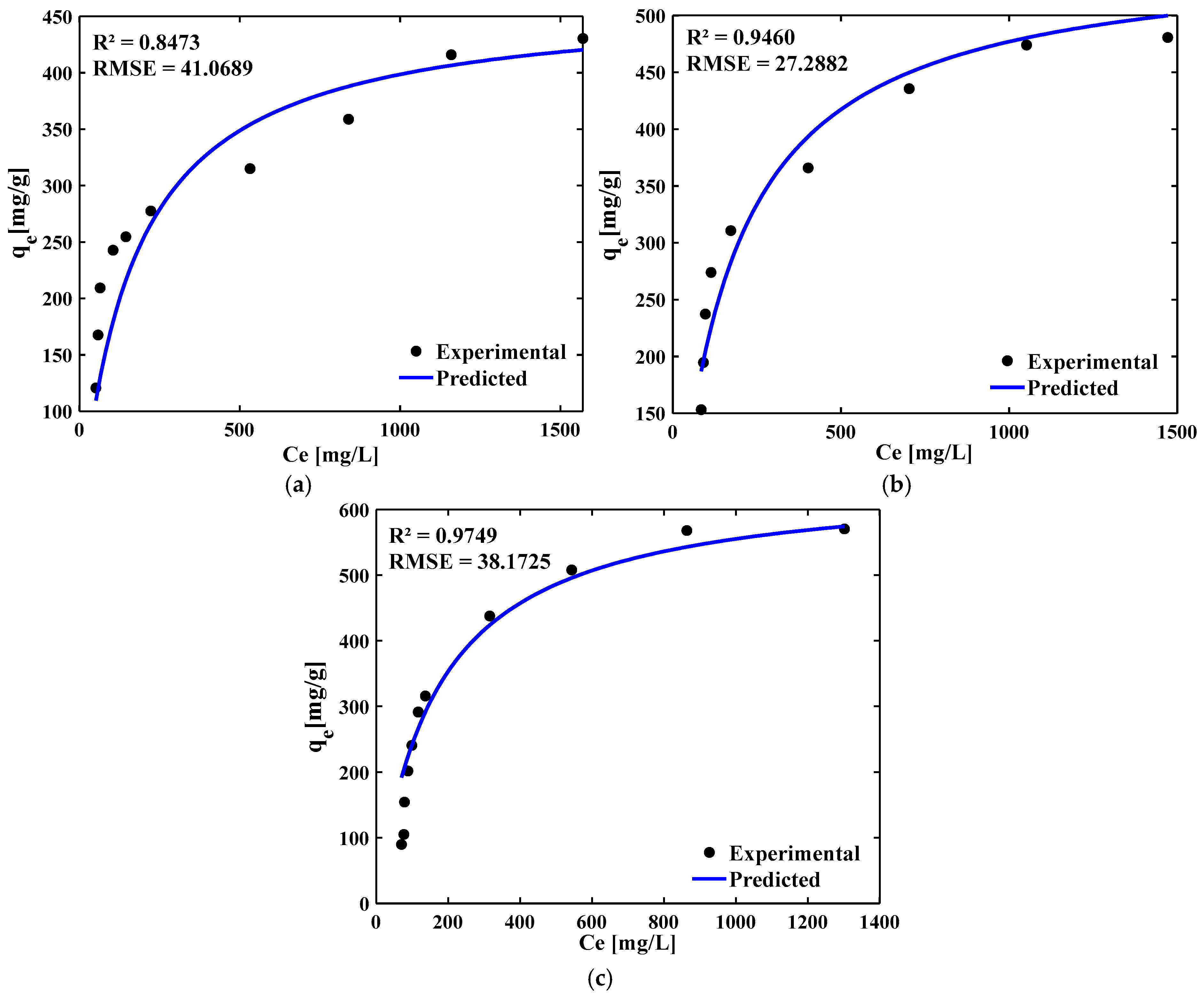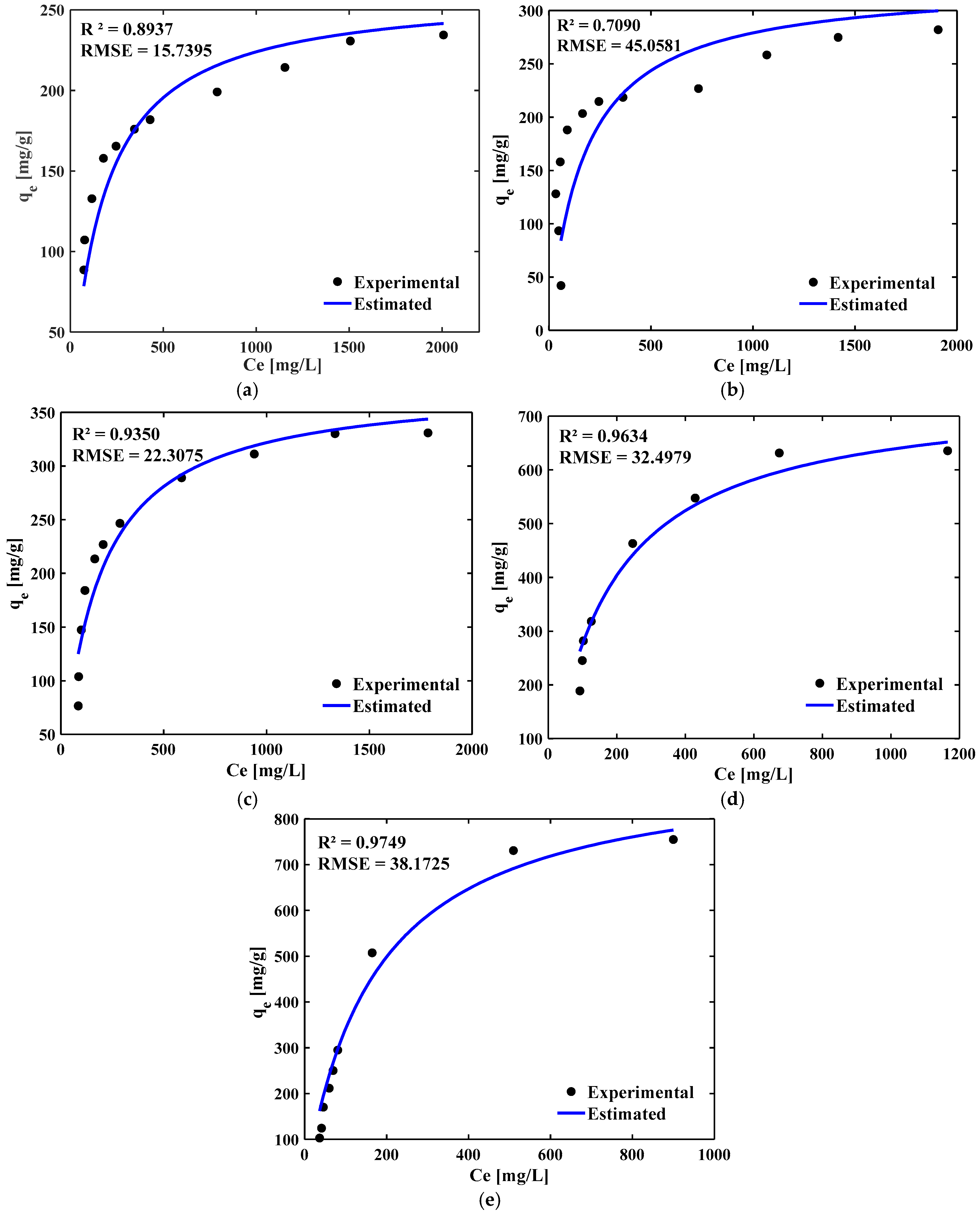 2) assumed values above 0.9, indicating that the model represents more than 90% of the variability observed in the copper ion sorption isotherms under the established conditions. In parallel, the relatively low values of the root mean square error (RMSE), ranging between approximately 7.8 and 36.1 mg/g, reinforce the quality of the individual fittings. These results indicate that the average differences between the values predicted by the model and the experimental data were small, showing that the estimates of Q