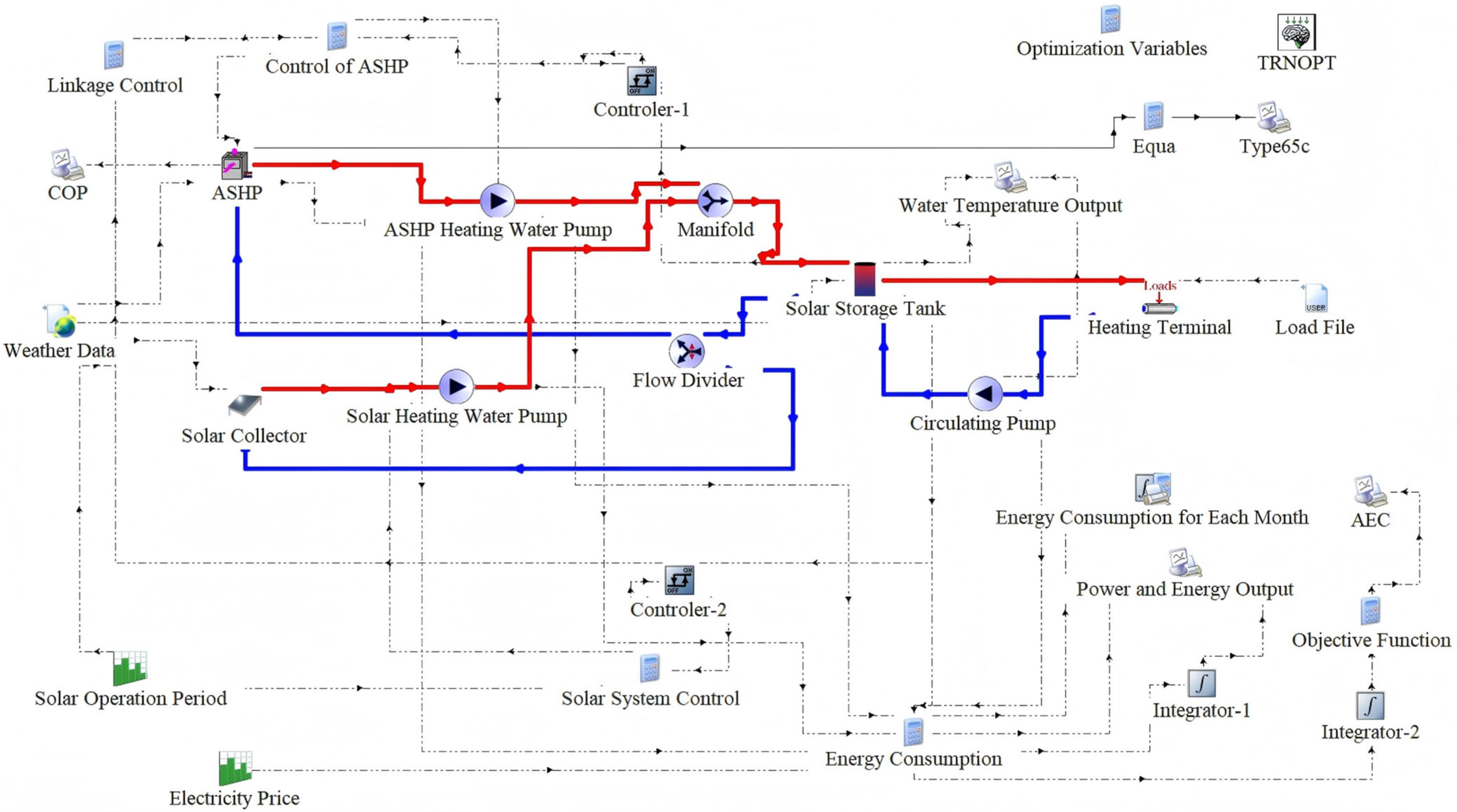 - The model’s core operation revolves around the thermal storage tank (Type158), which acts as the central hub for heat collection, storage, and delivery. The system operates based on the following logic and interconnections: