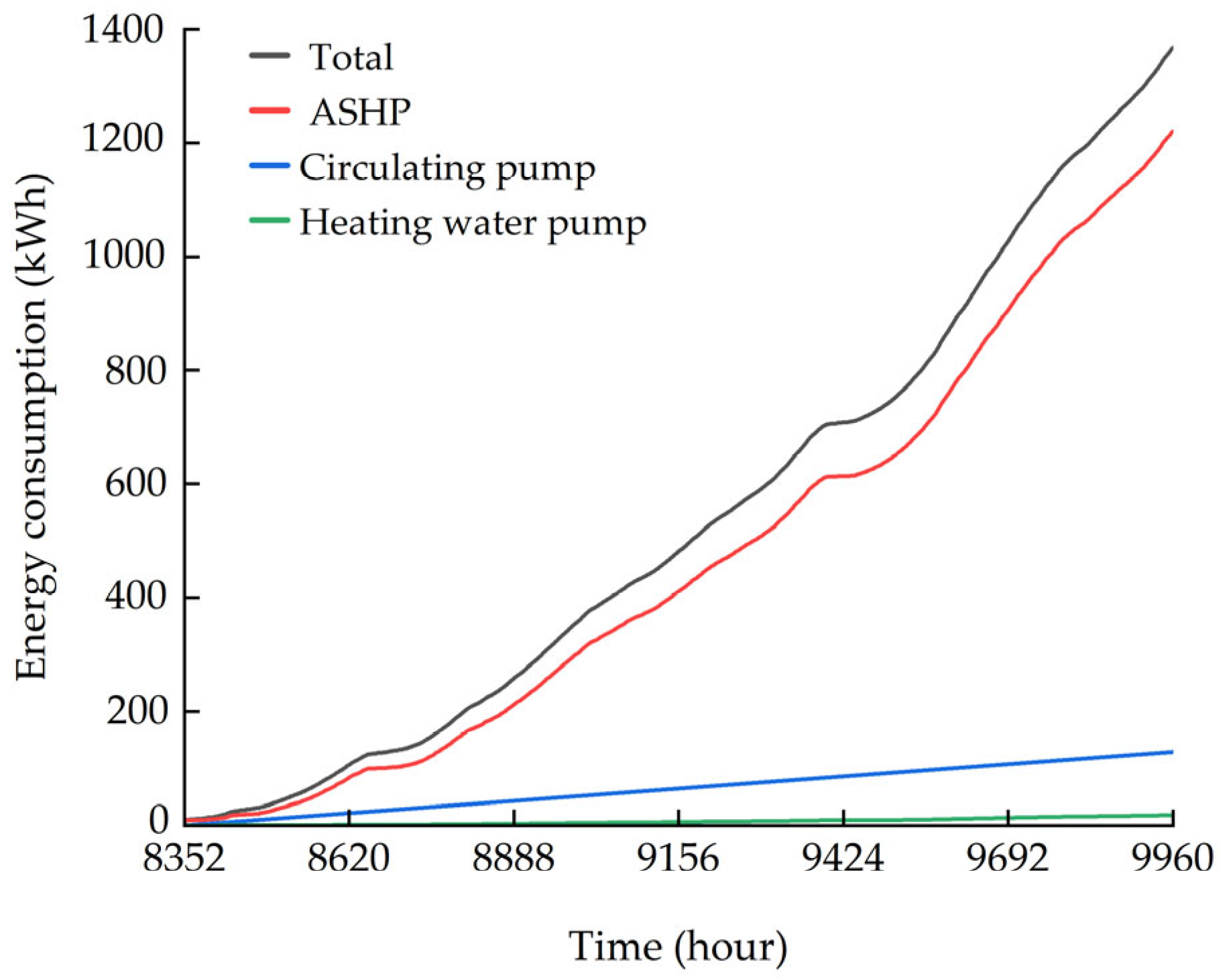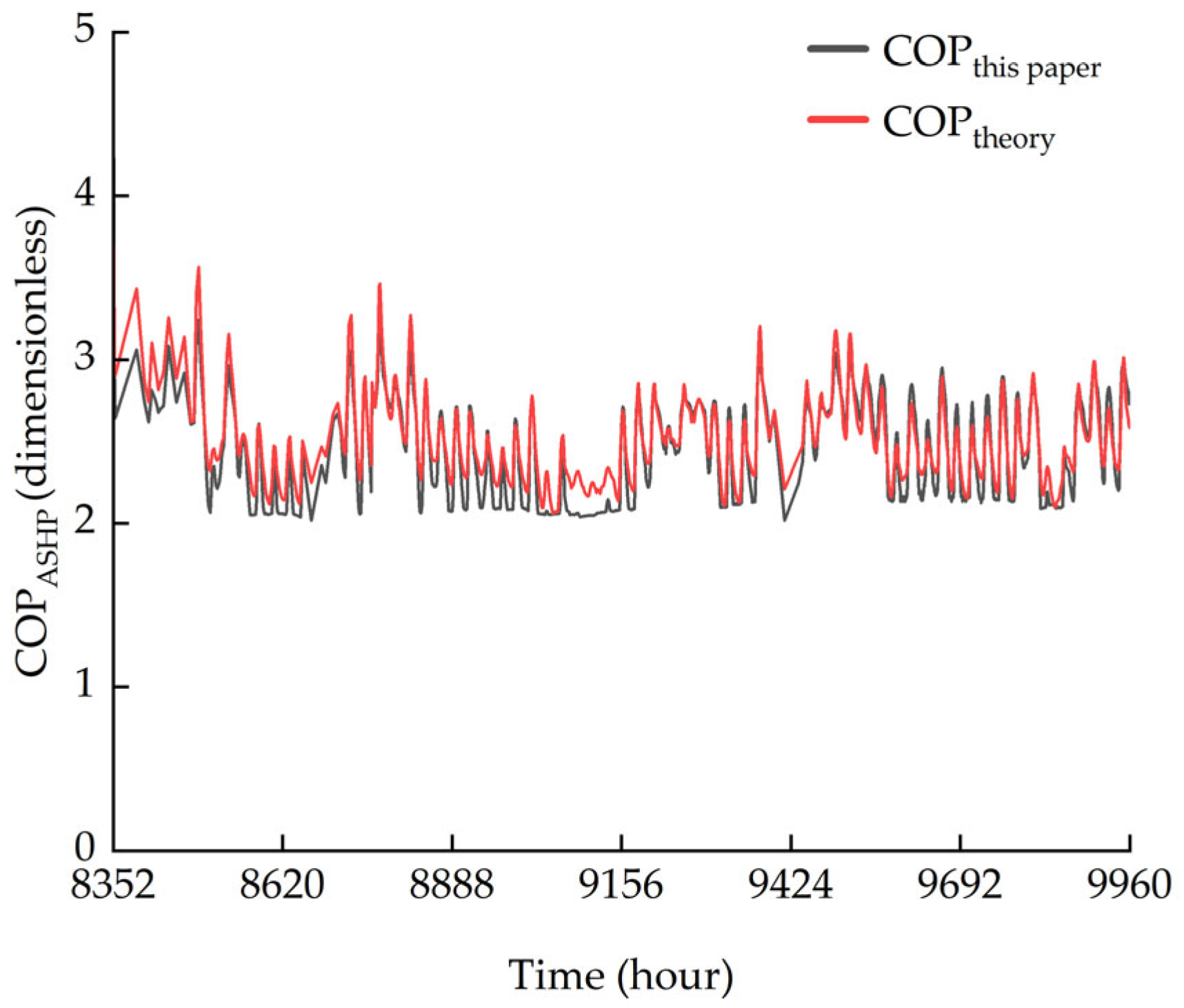 - In this design scheme, the supply and return water temperatures are generally within the range of 45/35 °C. The cumulative total energy consumption of all equipment is 1354.01 kWh. The COP of the air source heat pump is 2.43, while the COP of the system is 3.67. Furthermore, the thermal comfort calculation is based on the center point of the room, and the results show that the room is in a C-level thermal comfort state. This 51% improvement in overall system efficiency not only validates the integration methodology but also indicates reduced grid dependency during operation while ensuring consistent comfort.