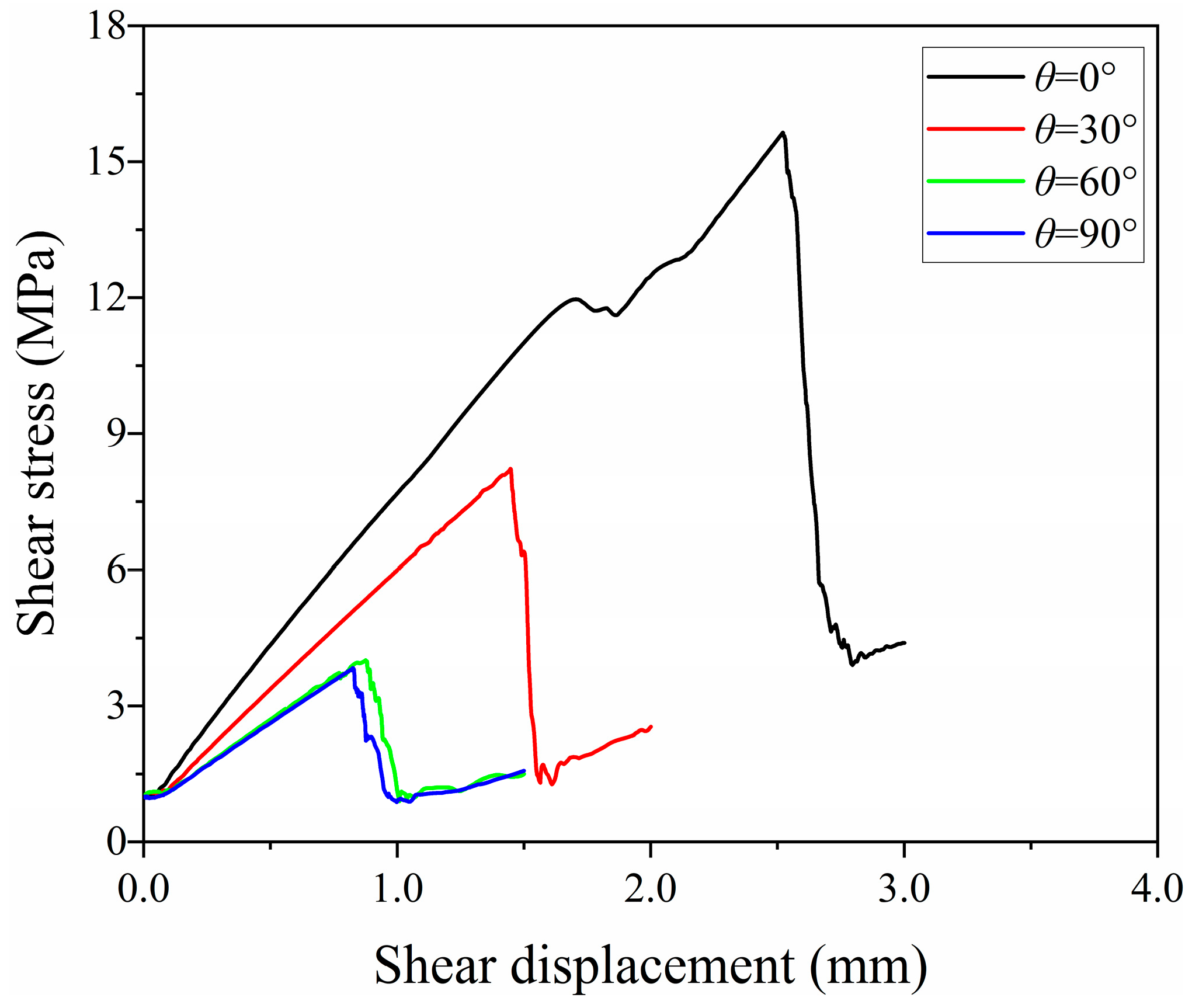 θ = 30°/60° (bedding obliquely intersecting the shear plane): Both the peak stress and residual strength decrease, and the curve fluctuates more obviously (e.g., θ = 30°). This indicates that when the bedding obliquely intersects the shear plane, cracks tend to initiate and propagate along the intersection area of the bedding plane and shear plane, resulting in more scattered damage and a complex failure mode.