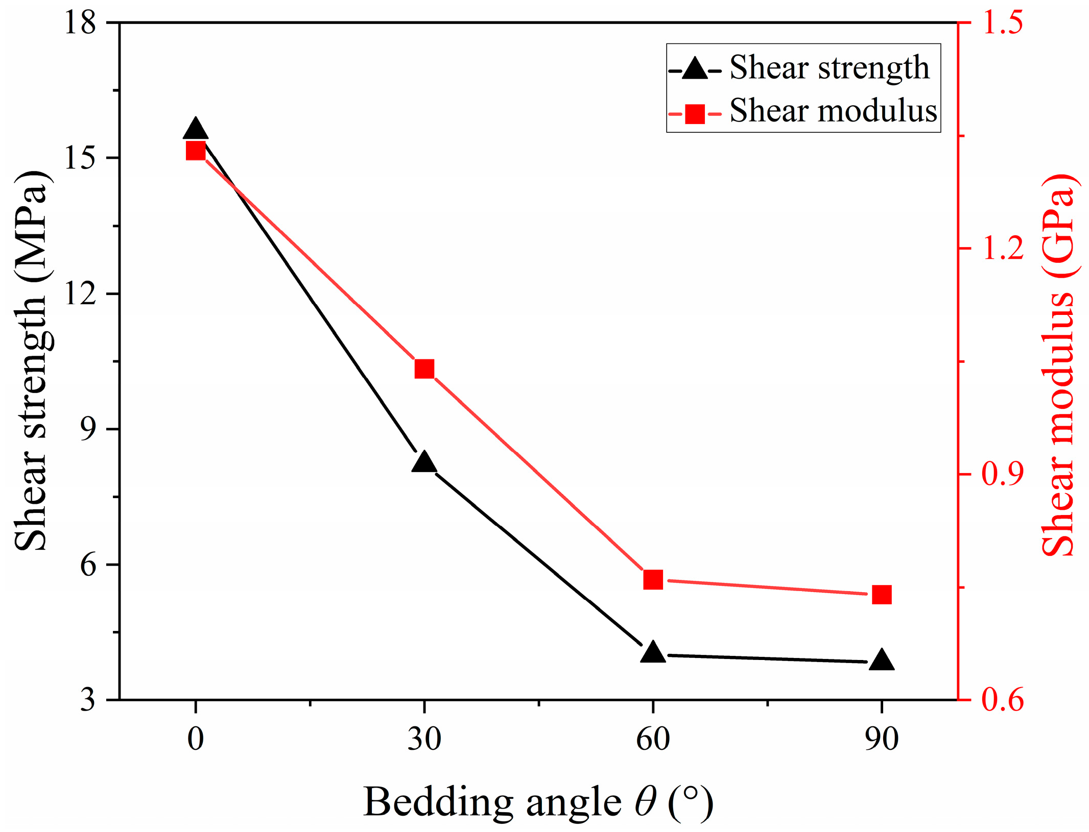 Figure 4 that as the BA increases from 0°to 90°, both the shear strength and shear modulus show a significant downward trend, with the attenuation rate being fast in the early stage and tending to flatten in the later stage.