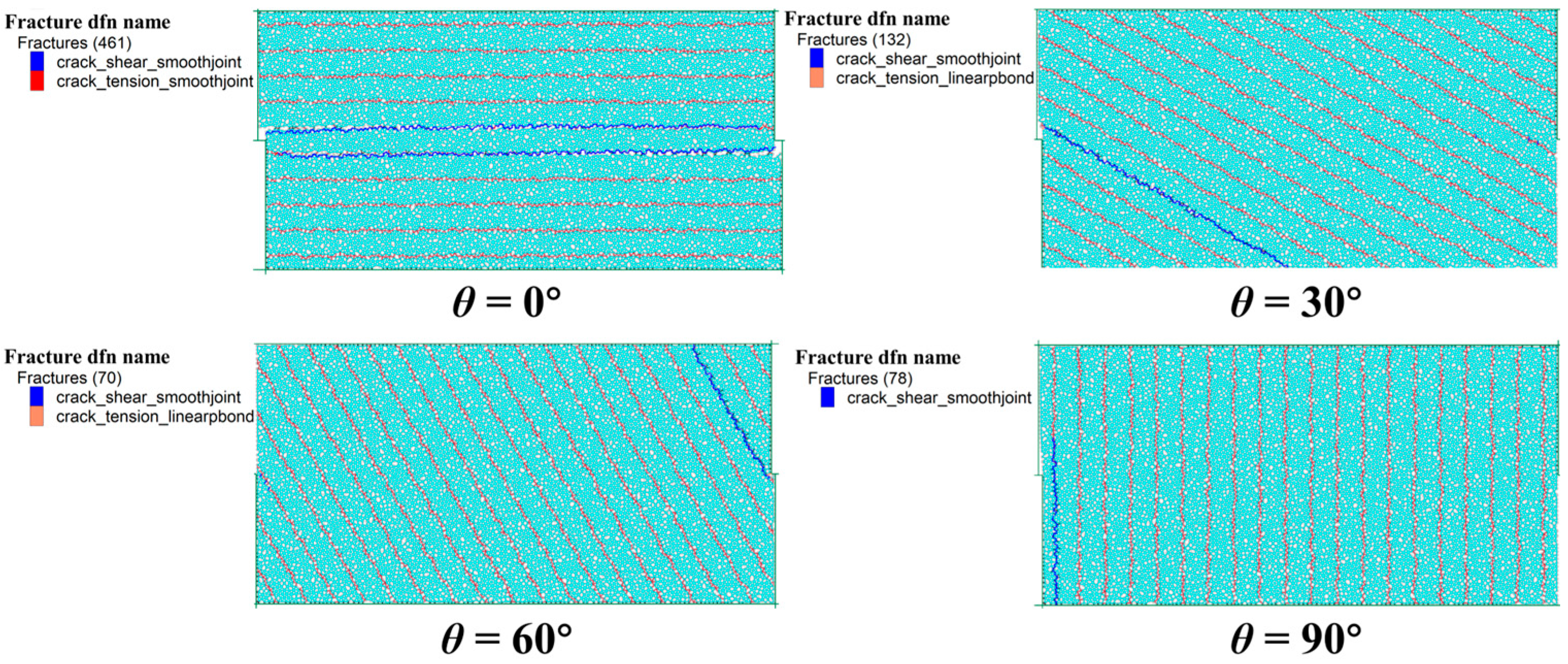 Figure 5 (where red represents shear cracks in smooth joints, blue represents tensile cracks in smooth joints, and orange represents tensile cracks in the matrix). When θ = 0° (bedding parallel to the shear plane), cracks are distributed in horizontal bands and extend along the bedding plane (blue cracks). This is because when the bedding is parallel to the shear plane, shear forces easily cause particle sliding within the bedding plane and damage to the weak connections between beddings, making cracks preferentially initiate and propagate along the bedding plane, thus exhibiting the characteristic of “shear failure along the bedding”.