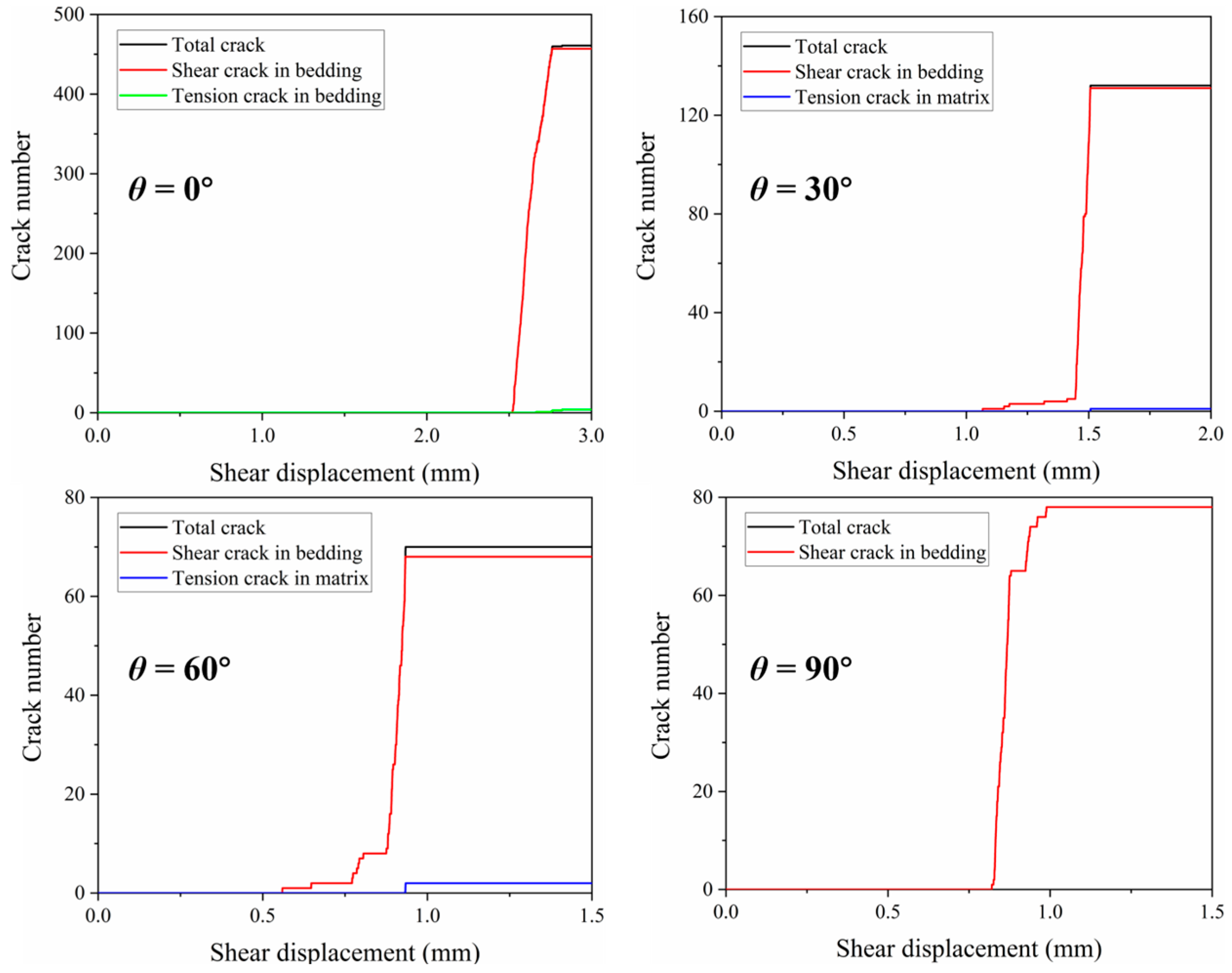 When θ = 30°, shear cracks on the bedding plane still play a dominant role. Before the shear displacement reaches approximately 1.2 mm, there are a small number of shear cracks on the bedding plane, and tensile cracks in the matrix are almost nonexistent. When the displacement exceeds 1.2 mm, the number of shear cracks on the bedding plane increases rapidly, and a small number of tensile cracks also appear in the matrix, though their quantity is far less than that of shear cracks on the bedding plane. This indicates that for coal samples with a 30° BA during shearing, failure is dominated by shear along the bedding plane, while a small amount of tensile failure in the matrix begins to occur simultaneously.