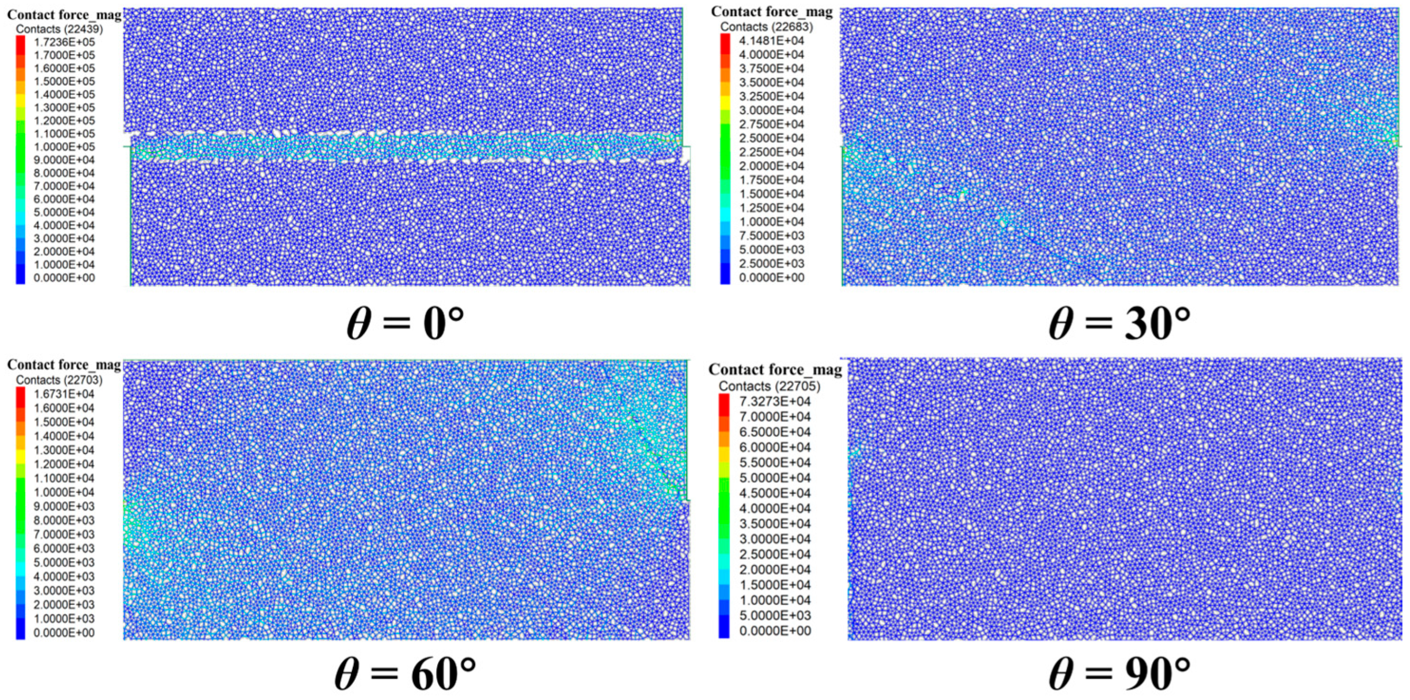 At θ = 30°, contact force chain magnitudes distribute more dispersedly, with reduced differences between bedding and matrix regions. Medium-to-low magnitude chains increase in proportion, while high-magnitude ones shrink and disperse. This reflects complex stress transmission paths due to combined bedding shear and matrix tension, preventing force chain concentration in single regions and reducing overall magnitudes. Such dispersion drives multi-regional microcrack propagation. At θ = 60°, contact force chains are dominated by medium-to-low magnitudes, with high-magnitude ones extremely rare and highly dispersed. This reflects more balanced internal stress transmission under θ = 60°, as weakened bedding constraints prevent high-strength force chain concentration. With relatively uniform stress borne synchronously across multiple coal regions, this aligns with dispersed microcrack initiation and propagation in both bedding and matrix. The low-magnitude, dispersed force chains support uniform damage under the complex failure mode. At θ = 90°, contact force chain magnitudes show local concentration: medium-to-high values appear in non-bedding regions, while those near bedding are relatively low. Under shear of perpendicular bedding, the bedding plane impedes stress transmission, making force chains bypass it to concentrate in other coal areas as localized high-magnitude chains. Shear sliding along bedding prevents high-strength chain accumulation there, and this local concentration drives rapid microcrack propagation and coalescence along the bedding.