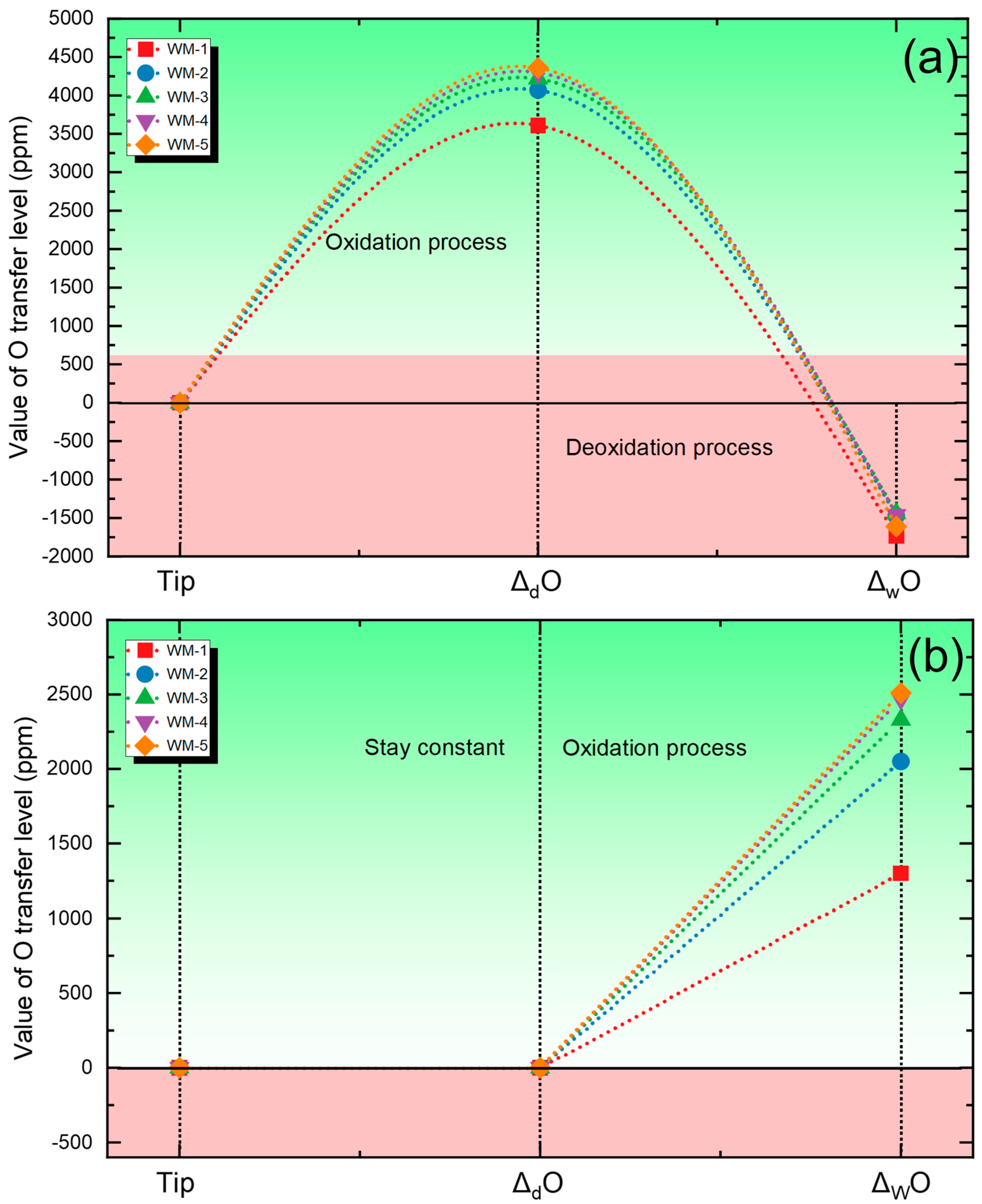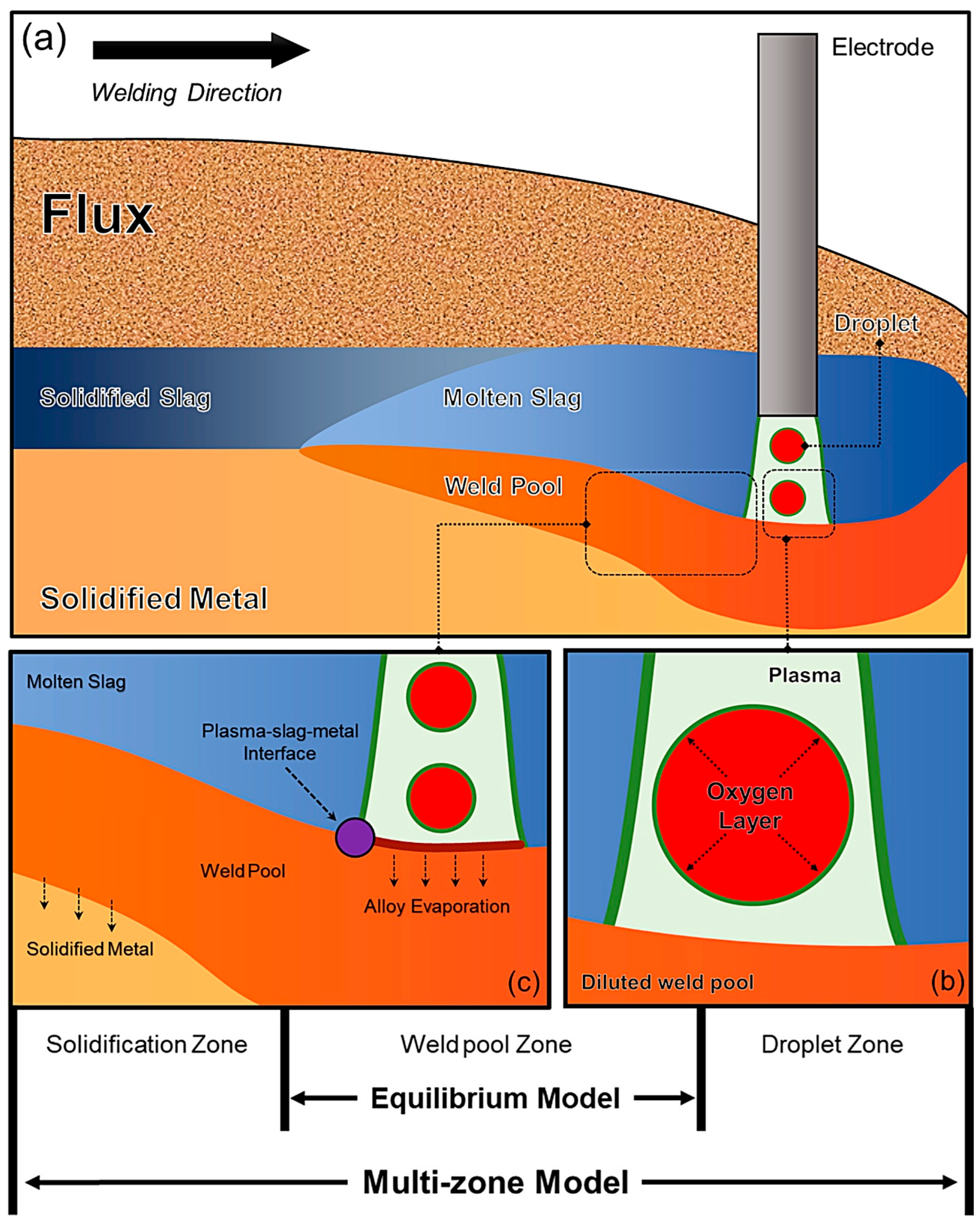 - The results revealed that O is significantly enriched in the molten droplet zone due to the decomposition of Cr2O3 under high-temperature arc conditions. This O enrichment leads to subsequent deoxidation reactions in the weld pool, which were well captured by the proposed cross-zone model.