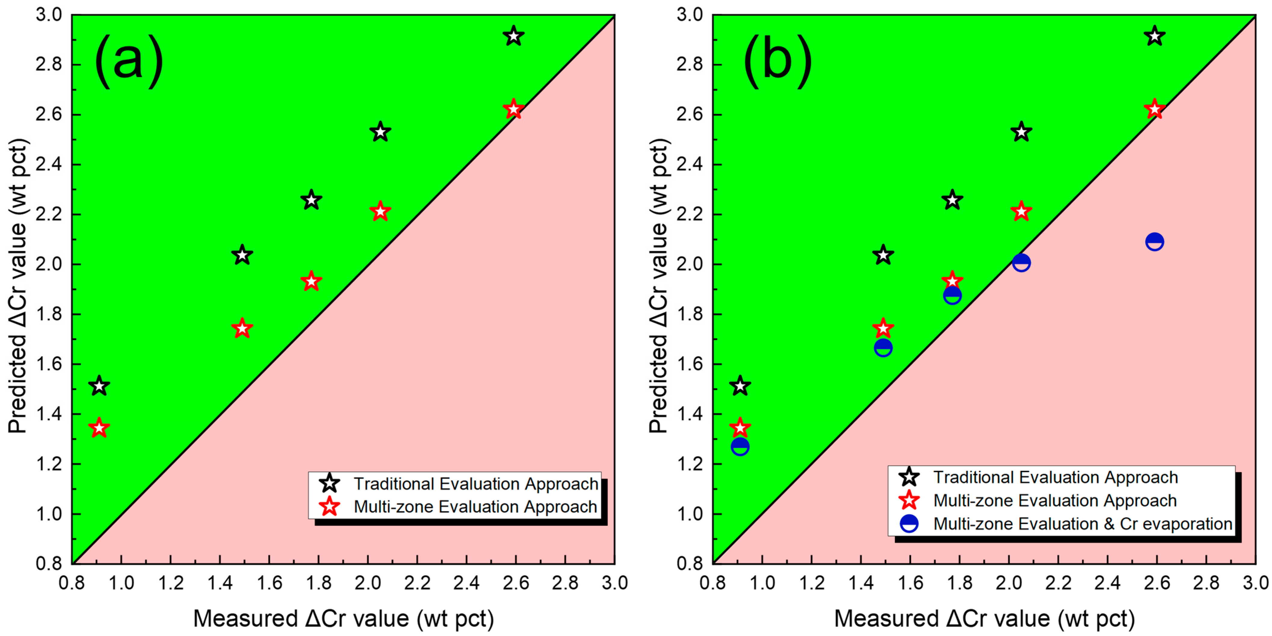 - The transfer behavior of Cr was found to be strongly influenced by both thermodynamic factors and evaporation Cr loss. While the activities of Cr2O3 and CrO increase with rising Cr2O3 content in the flux, the accompanying increase in O potential within the droplet zone tends to inhibit Cr transfer into the weld metal. Incorporating evaporation loss into the cross-zone model further improved the accuracy of ΔCr prediction.