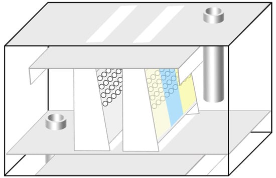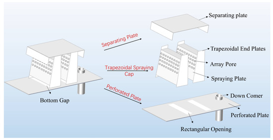 The geometrical structure of the CTST is illustrated in Figure 1. It mainly consists of three parts: the bottom perforated plate, the middle trapezoidal spraying cap, and the top separating plate. There are rectangular openings in the bottom perforated plate. They provide the rising channels for the gas to enter the spraying cap. Above the opening is the trapezoidal spraying cap. The cap is analogous to a hollow frustum with two (front and back) supporting trapezoidal plates and two side spraying plates. Generally, spraying caps come in pairs. Arrayed pores are punched in the side spraying plates. Meanwhile, there is a bottom gap between the spraying plate and the bottom perforated plate. It allows the liquid to flow into the spraying cap. The upper separating plate caps the paired spraying caps to reduce entrainment. Between the spraying cap and the separating plate, there is a fluid channel for gas–liquid separation.