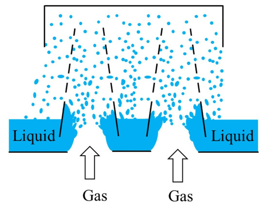 It is noted that liquid columns are generally formed through arrayed pores at the spraying plates, as shown in Figure 8. In the analysis of liquid column dispersion modes, we introduce the Weber number (We) to describe the ratio of the force exerted on the drop by the external gas flow to the surface tension of the drop itself, which is defined as follows [25]: