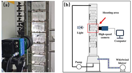 Studies have shown that most researchers have primarily focused on the modeling, simulation, and computational analysis of two-phase flow in CTSTs, successfully obtaining a series of key information, such as liquid film flow characteristics and droplet distribution laws [24]. However, research on the behavior and mechanisms of droplet dispersion remains a gap in the existing literature, which is far from meeting practical industrial demands. The present work aims to investigate how drops are dispersed in spraying trays (CTSTs as a typical example) and to determine its dispersion mechanism. Section 2 describes the experimental apparatus and how to capture the dispersion behavior of drops. Section 3 describes the method of establishing a simulation model. Section 4 analyzes the experimental results through simulation and experimentation. Section 5 provides a brief conclusion.