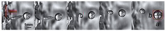 After a mass of liquid leaves a pore, on the one hand, it might continuously deform and gradually turn into a drop; on the other hand, the liquid mass also probably eventually breaks into two or more daughter drops. In order to standardize the size of the drops, the diameter of the pore (5 mm) was adopted as the length reference to determine drop diameters. It was determined that the length per pixel is 0.04167 mm. Moreover, the diameter of a drop was measured when it was mostly closed to a sphere (or a circle in a plane) as much as possible. As shown in Figure 5, by measuring the major axis a and the minor axis b of the spherical drop on the plane, in this case, the drop diameter d is approximately equal to [25].