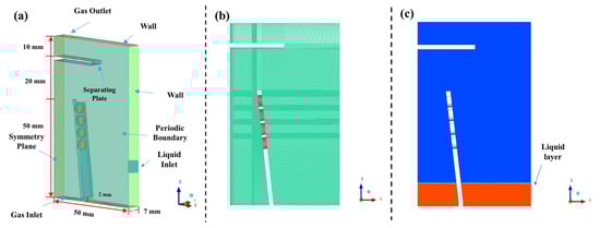 To reduce the calculation load and focus on the drop dispersion process in the CTST, a reduced domain of the CTST is adopted, as shown in Figure 6a. It keeps the typical spraying structure of the CTST, with four spraying pores in a column. The bottom orifice was set as the gas inlet. A liquid phase inlet was set at the side plane. The top orifice was set as the pressure outlet to the atmosphere. The wall surface was set as a non-slip boundary. The x = 0 plane was set to a symmetrical boundary. Both back and front planes were set as periodic interfaces.